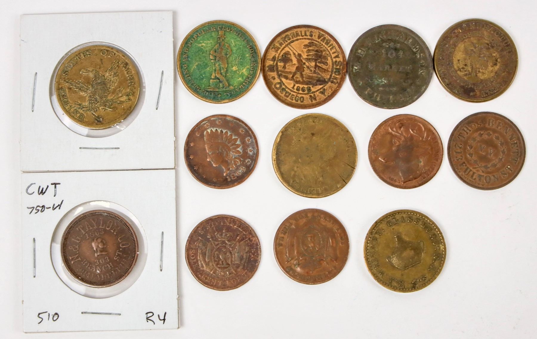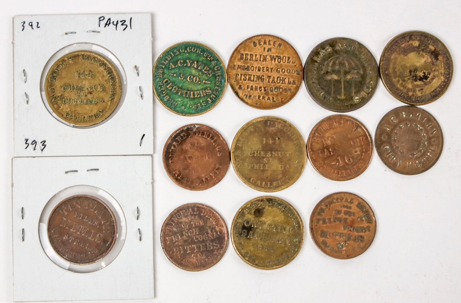 Lot of 13 tokens and store cards from the Civil War era. Roots Daguerretan Gallery Phila.; A. C. Yates Clothing; M. L. Marshall's Variety Store, Oswego, N. Y.; Edward Miehlings Meat Market; N & G Taylor & Co., Phila.; and many more.