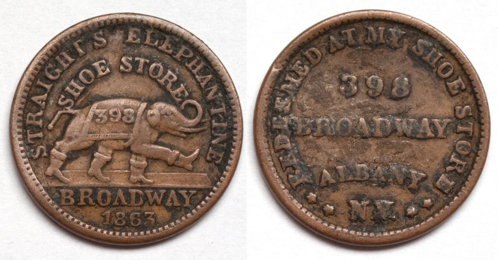 Straights Elephantine Shoe Store / Broadway / 1863 // Redeem at New York Shoe Store / 398 Broadway / Albany, NY. Nice Civil War piece. Good shape. Great picture of elaphant wearing shoes!City: AlbanyCounty: State: NYDate: