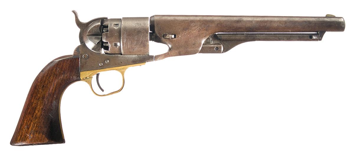 Manufactured in 1862, with a 4 screw frame cut for a shoulder stock. The top of the barrel has the one line New York address, "COLTS / PATENT" on the left side of the frame and the Texas naval battle scene, along with "D" and "C" inspector initials, on the cylinder. Inspector initials are also found on the barrel, brass trigger guard, and iron backstrap. Matching serial number on the barrel, frame, trigger guard and backstrap, with the cylinder numbered to a different gun (7676). Fitted with a smooth walnut grip stamped with an illegible cartouche on the right side. The wedge is a crude period replacement.