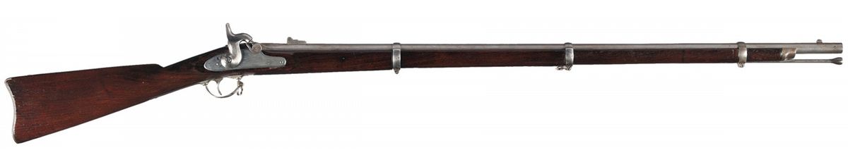Colt was given a contract to supply 112,500 of these 1861 Pattern muskets to the Union Army. Colt delivered 75,000 between 1861 and 1865. These muskets were finished bright with an oil finished stock. The National eagle/shield motif is on the bolster and the lock is marked "U.S./COLT'S PT F.A. Mfg Co/ HARTFORD Ct" ahead of the hammer. The rear of the lock plate and the top of the barrel at the breech are dated "1863", and the left barrel flat is stamped with "V/P/Eagle head" proofmarks parallel to the bore. The left side of the barrel is stamped with an "M". The front of the lower tang is marked with the letter "P" and the rear "W". Blade front sight on a square base which doubles as a bayonet lug and folding three leaf rear sight. The buttplate tang is marked " U.S" and "50" and the left flat has a faint inspectors cartouche. Complete with an original tulip head ramrod.