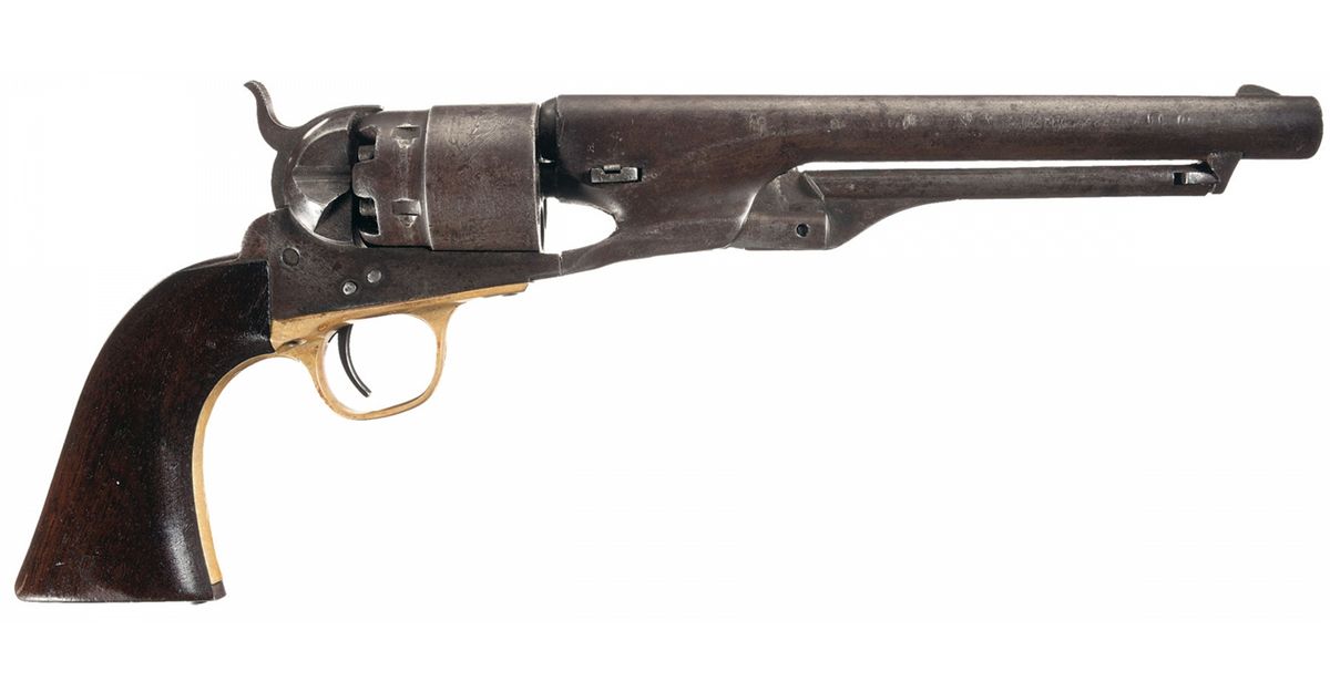 Three screw frame manufactured in 1863 with the New York barrel address stamping, the "COLTS/PATENT" marking on the left side of the frame and with the Texas-Mexico naval scene on the cylinder. The serial number "100936" is on the bottom of the barrel lug, bottom of frame, in front of trigger guard and on the butt with the number "0936" on the cylinder. The recoil shields and butt are cut for a shoulder stock. The letters "GG" are stamped on the left side of the barrel to the right of the wedge screw and on the cylinder over the serial number. There is an "H" stamped on the rebated portion of the cylinder and on the rigth side of the barrel near the wedge and an "S" stamped on the bottom of the barrel. The brass front strap is stamped with a "D". Fitted with a smooth one-piece walnut grip with a boxed "FJ" cartouche on the right and a boxed "WHR" on the left.