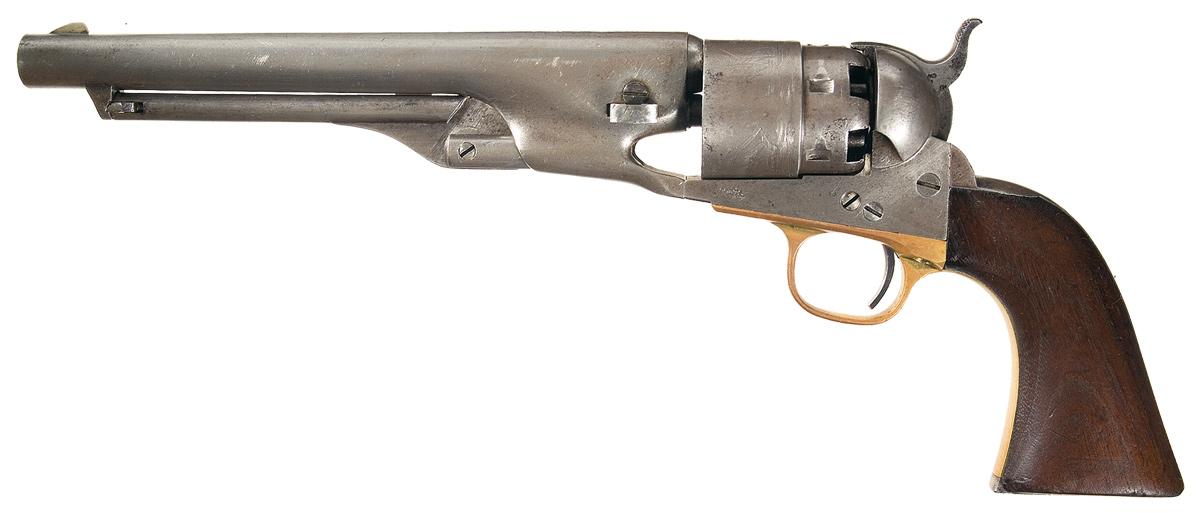 Manufactured in 1863, with a 3 screw frame cut for a shoulder stock. The top of the barrel has the one line New York U. S. America address flanked by dashes, "COLTS / PATENT" on the left side of the frame and the Texas naval battle scene on the cylinder. Inspector initial "H" is found the left side of the barrel just to the right of the wedge screw, "E" on the right side, "H" on the front portion of the cylinder and "E" on the rebated portion, "T" behind the trigger guard bow and on top of the backstrap. Matching serial number on the barrel, frame, trigger guard, and backstrap and partial number "9375" on the cylinder. The wedge is secured too tightly to check internal parts. Grip stamped with legible three letter boxed cartouche on the left side and boxed "JT" on the right side.