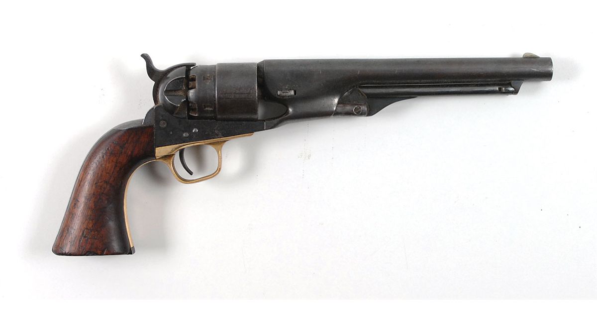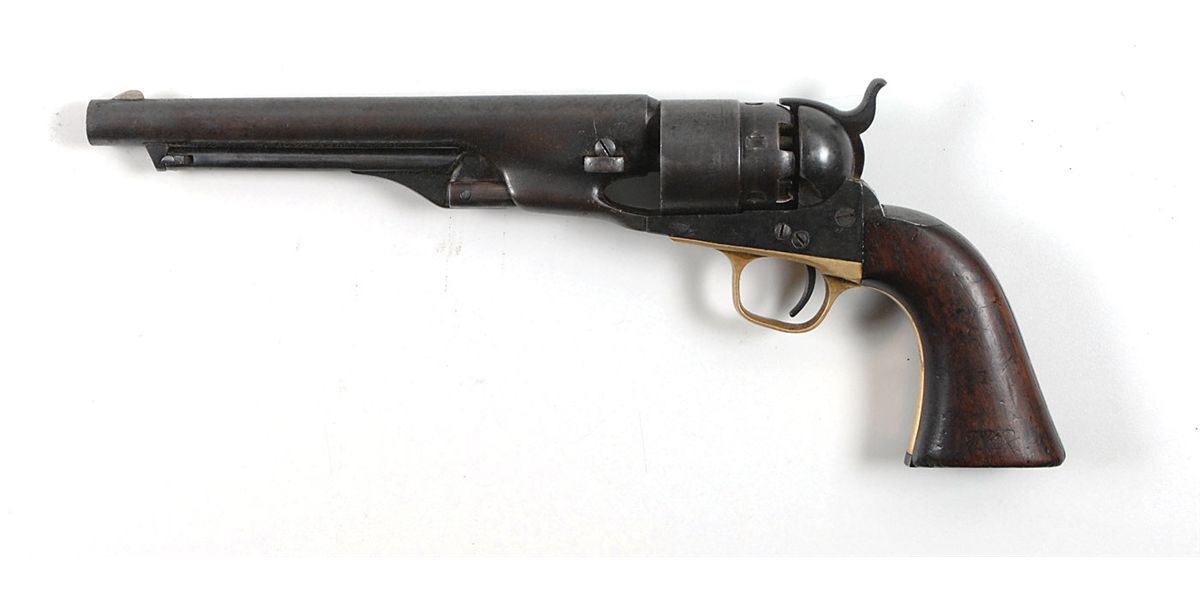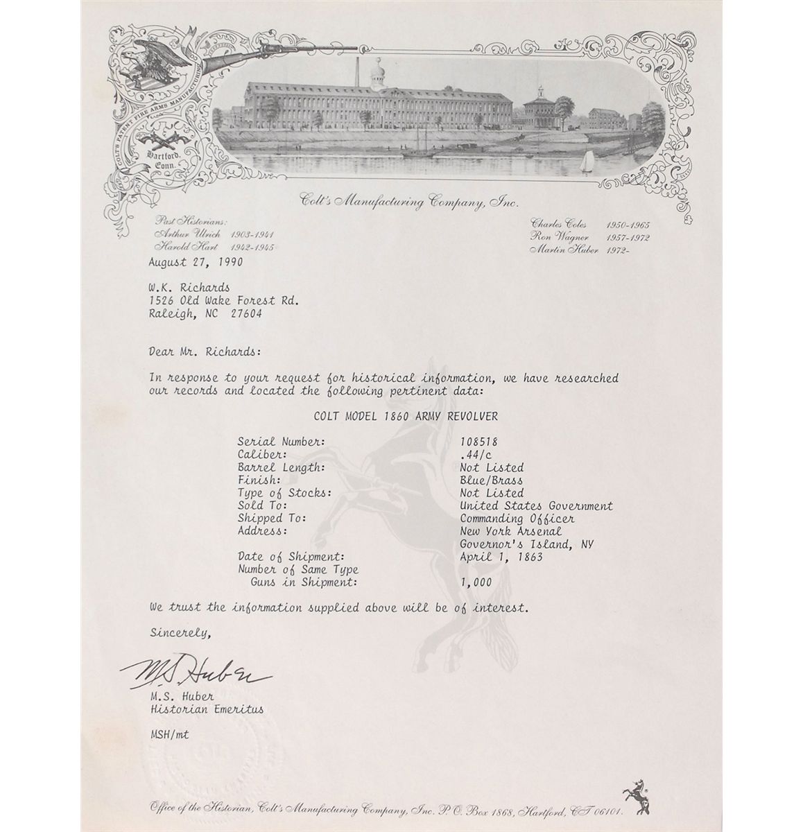Serial #108518, caliber .44 with an 8? round barrel having a fine, bright bore. All serial numbers match, including the wedge. The revolver is in fine working order with the exception of a weak bolt spring (an inexpensive and easily replaced part). The major metal parts have single or double letters stamps of government inspectors, the one piece walnut grip has lightly worn but very legible government inspector’s cartouches, “J. T.,” and “W. H. R.” The cylinder retains 98% of the naval engagement scene with a tiny bit of pinprick pitting, all other factory markings are in excellent condition. About 40% of the original military blue finish remains, mixing with plum patina. The frame, hammer, and loading lever case colors are dark, but most of them remain. The grip has a few very small chips missing from the butt; overall condition is fine. The included Colt factory letter indicates that this was one of 1,000 similar revolvers shipped on April 1, 1863, to the New York Arsenal on Governor’s Island.