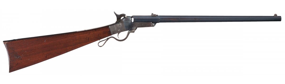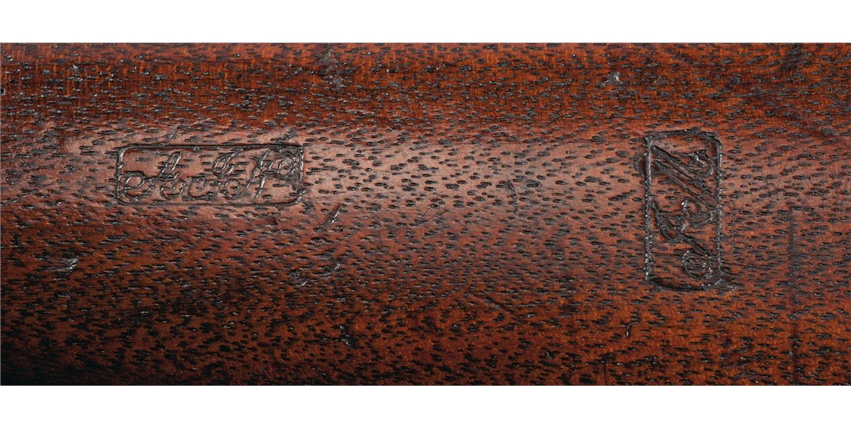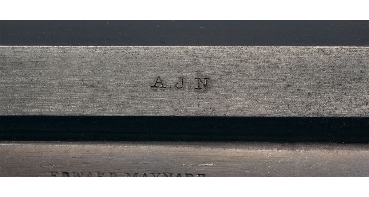 This is an example of a Second Model (also known as the "Model 1863"), Maynard carbine that was manufactured circa 1860 to 1865, with approximately 20,000 total production. Among the Union cavalry regiments armed with these Maynards were the 9th and 11th Indiana and the 11th Tennessee. The three line "MASS. ARMS CO." address is marked on the right front of the frame and four line "1851/1856" Maynard patent marking on the left side. Left barrel flat has "A.J.N." inspector marking and an "S" on the saddle ring base. Equipped with pinched front and a three leaf folding rear sights. Saddle ring bar with ring mounted on the left side of the receiver. Smooth straight grip stock with two clear boxed "AJN" and "JM" cartouches on the left side of the wrist and fitted with a crescent buttplate.