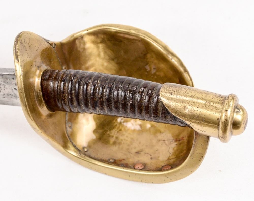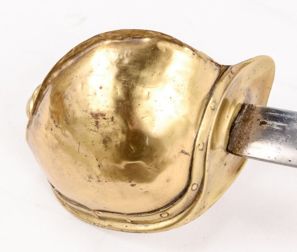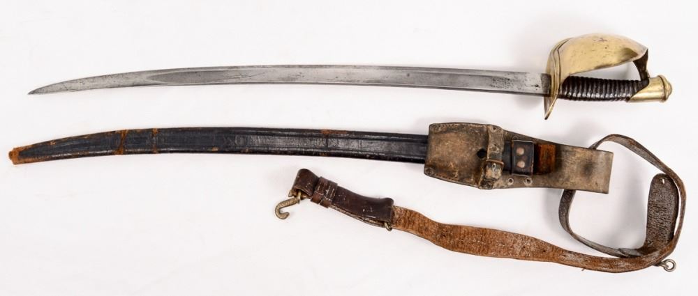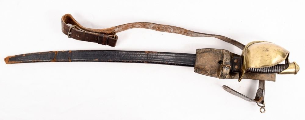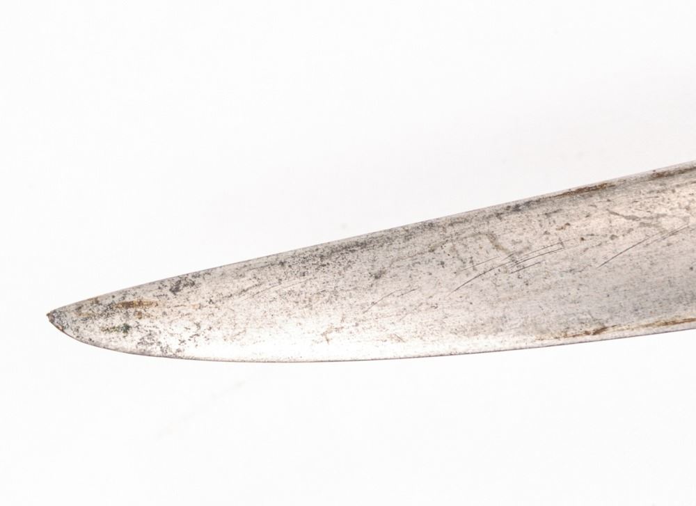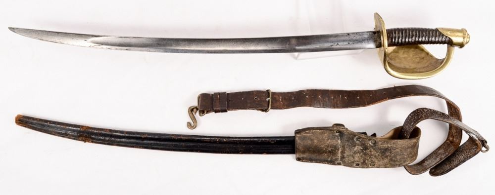 This US Navy Model 1860 naval cutlass includes scabbard, frog, and belt. The blade is unmarked, which was not uncommon. It measures 3 5/8"L with a 25 3/4"L blade. The very rare scabbard, belt, and frog are supple but dry. The frog is unmarked. The belt, which is British, is marked J. Darch and Sons, London, Canada, 1015, with broadhead.. The buckle is a double headed sea serpent. The cup has some dents and 4 rivets have been replaced in it. There is some pitting on the blade. The wire wrap is missing. The scabbard is fragile with cracks and broken loop. The drag is missing.