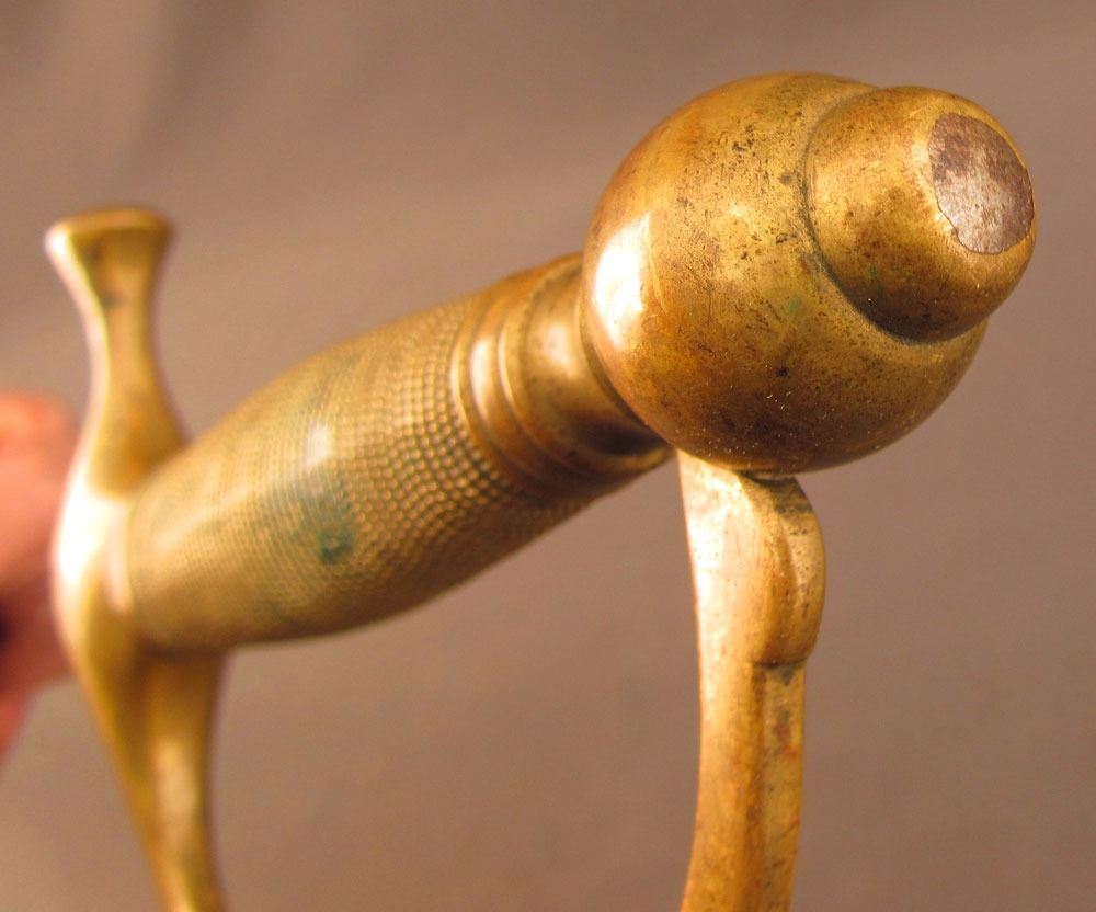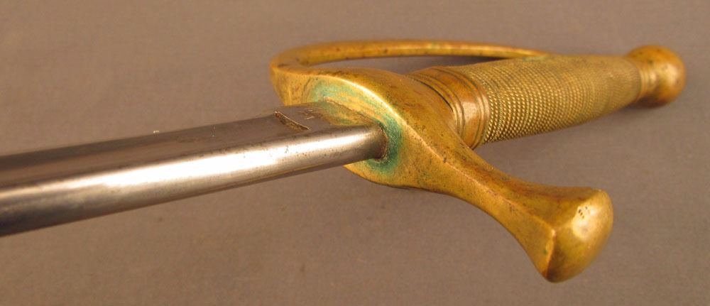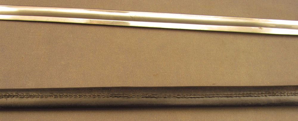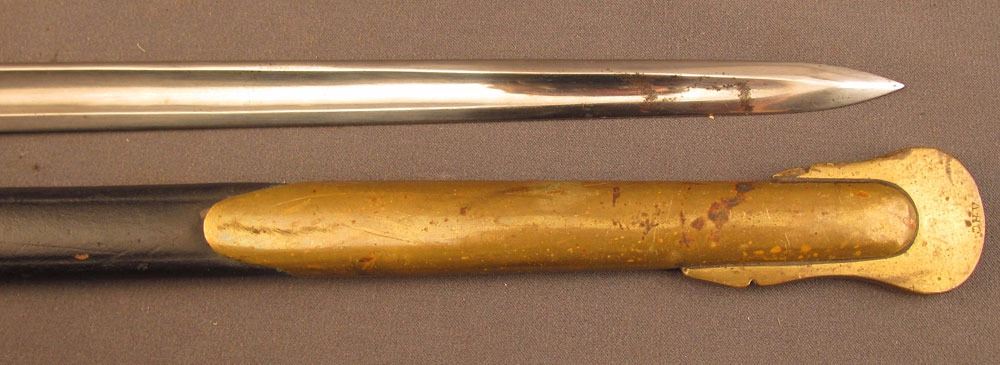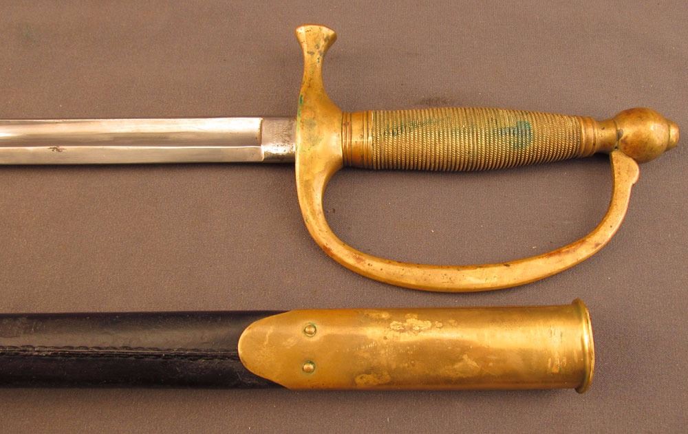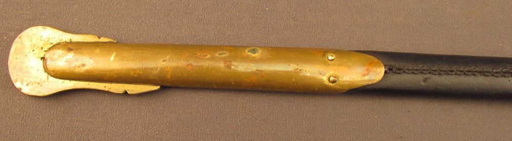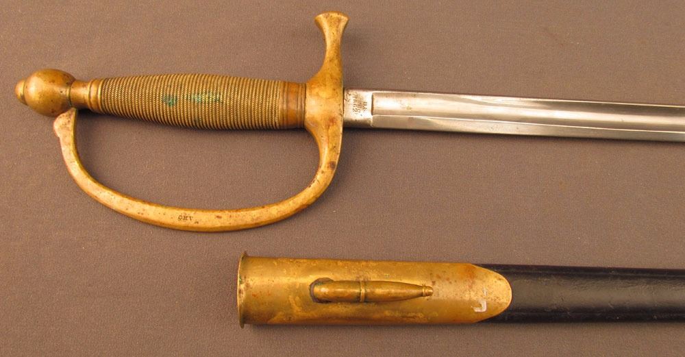 Civil War–dated US Model 1840 Musician’s Sword by Ames, measuring 34 1/2? long with a 28 1/8? straight, single-edged blade having full-length single fullers. The steel retains its bright, original polish with some scattered specks of mild freckling here and there, most noticeably at the tip. The Ames ‘scroll’ trademark is present on the ricasso reverse, while the obverse is stamped and dated, “US / AHC / 1862.” The cast brass hilt has a mostly dark, yellow-ochre patina, but does also have some large dark spots of verdigris on the sides of the grip. The scabbard is in very good shape with lightly tarnished brass fittings and a moderate amount of crazing along the black leather body. A classic example of the M1840 musician’s sword boasting a desirable 1862 war date.
