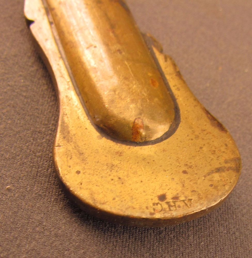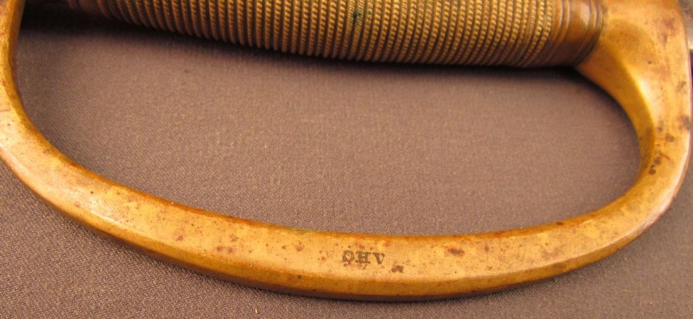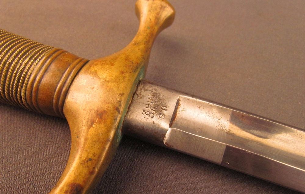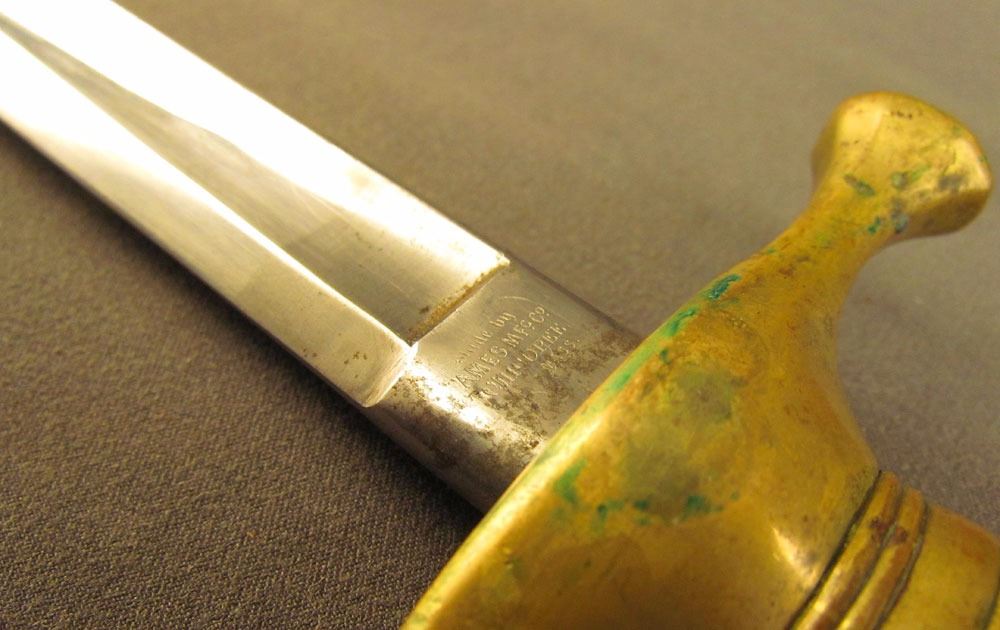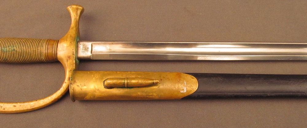 Civil War–dated US Model 1840 Musician’s Sword by Ames, measuring 34 1/2? long with a 28 1/8? straight, single-edged blade having full-length single fullers. The steel retains its bright, original polish with some scattered specks of mild freckling here and there, most noticeably at the tip. The Ames ‘scroll’ trademark is present on the ricasso reverse, while the obverse is stamped and dated, “US / AHC / 1862.” The cast brass hilt has a mostly dark, yellow-ochre patina, but does also have some large dark spots of verdigris on the sides of the grip. The scabbard is in very good shape with lightly tarnished brass fittings and a moderate amount of crazing along the black leather body. A classic example of the M1840 musician’s sword boasting a desirable 1862 war date.