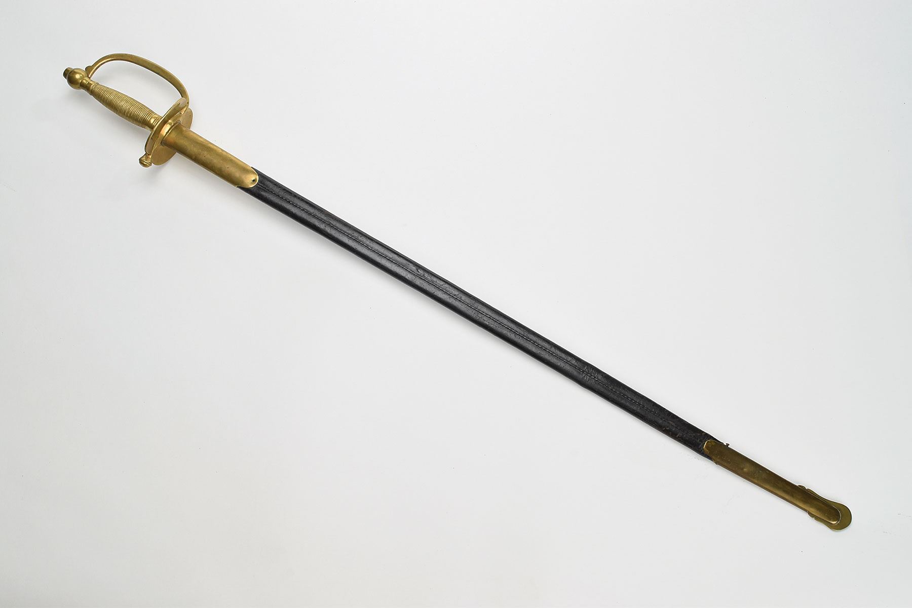 Desirable Civil War US M1840 non-commissioned officer's sword dated 1863, measuring 38? overall, with a 31 7/8? straight, single-edged blade with wide, single fullers. The blade is excellent, with only some residual freckling present in spots along its length, and has a bright patina with lightly struck markings at the ricasso: "U.S. / 1863 / (F.)S.S." on the obverse; “C. RO(BY) / (W. CHE)LMSF(ORD MASS.) (in circle)” on the reverse. The brass hilt has a mild tarnish with crisp “F.S.S.” inspector stamp on the knucklebow, and a slight bend to one of the counterguards. The scabbard is in fine shape with only a few very minor dents on the brass throat and chape, as well as intact, lightly flaked black leather. This is a fine-near excellent example of a Civil War issued sword, by a desirable maker.