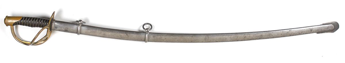 The 35? blade is marked "U.S. / J.M. / 1864" and on the opposite side of the ricasso is "EMERSON / & / SILVER / TRENTON / N.J." The markings are in excellent condition. The blade has been cleaned to bright with some large patches of faint to fine pinprick pitting. The blade has not been sharpened and there are no nicks in the edge. The blade washer is still present. The brass guard has an attractive mustard brown patina with the underside retaining original bright gilding. The grip retains all of the original wire binding and the leather wrap shows almost no wear. The steel scabbard is gray with a little scattered dark age spotting and two minor dents.