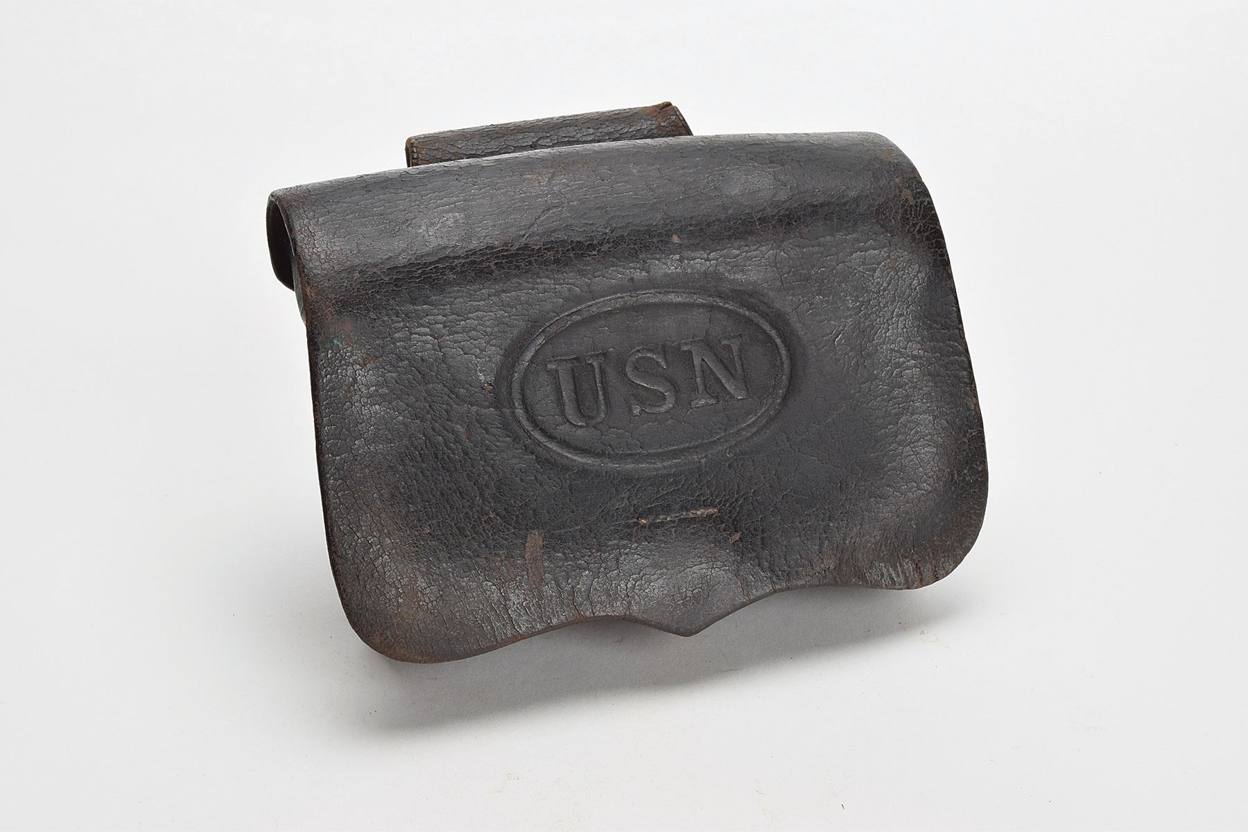 A belt-mounted revolver cartridge box with embossed “USN” on the cover flap, intended to hold six boxes of percussion revolver cartridges. The inner flap is marked “NAVY YARD / NY / (anchor) 1861 (anchor)”, and is still clear and legible despite mild surface crazing. The exterior leather is in very good condition, but does have further crazing, as well as some flaking along the edges of the cover, and on the flex points of the single belt loop on the back. The inner flap has some seam separation on one end. This is a hard-to-find Civil War navy item in good overall condition.