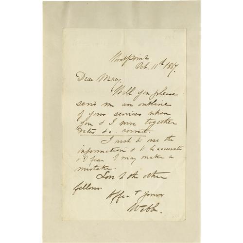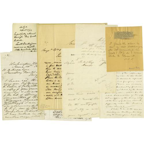 <B>Civil War: Union Generals: A good collection of 24 pieces in a variety of formats.</B></I> Includes <B>William T. Sherman</B></I> signature with closing removed from a letter "<I>Your friend W. T.</B></I>". <I>Mounted to a larger sheet</B></I>; <B>Joseph Hooker</B></I> Signature adding "<I>Maj Genl</B></I>" on a 3 x 1 inch card; <B>Joseph Hooker</B></I> Signature adding rank as "<I>Maj Genl</B></I>" on a 3 x 1 inch card. Irregularly cut at top left grazing signature, toned; <B>John E. Wool</B></I> A.L.S. February 26, 1864 writing that "<I>...it would be singular, as it appears to me, if the application to carry my case to the United Sates Court would be refused. Gudeman is a Georgian and a rebel. I have an invoice of goods purchased by Gudeman which sir I hold by the United States. They were intended for three rebels. I am a citizen of New York and an officer of the Army, acting at the time of Gudeman's arrest, officially under the orders of the President...</B></I>"; <B>William D. Whipple</B></I> A.L.S. September 25, 1892 concerning his leaving Washington; <B>Alexander S. Webb</B></I> A.L.S. October 11, 1867 requesting information. <I>Mounted</B></I>; <B>John Williams</B></I> A.L.S. January 14, 1856 concerning the Congressional directory; <B>Seth Williams</B></I> A.L.S. February 15, 1866 sending autographs; <B>Samuel B. Holabird</B></I> mounted signature adding rank; Admiral <B>Charles Wikes</B></I> A.L.S. April 15, 1838, <I>Mounted</B></I>; <B>Amos Eaton</B></I> A.L.S. June 14, 1874 regarding a monument; <B>James A. Hardie</B></I> A.L.S. April 9, 1863 regarding a commission; <B>John M. Thayer</B></I> A.L.S. September 20, 1880 concerning a veterans reunion; <B>Lorenzo Thomas</B></I> L.S. June 2, 1840 assigning Capt. E. Schriver as Inspector General; <B>Joseph Totten</B></I> L.S. November 8, 1862, requesting "<I>...a list of the Counties comprising each Congressional District...</B></I>" to assist him in assigning cadets; <B>Edward D. Townsend</B></I> A.L.S. July 24, 1862; <B>Edward D. Townsend</B></I> printed L.S. April 9, 1869 announcing the death of William A. Nichols; <B>Edward D. Townsend</B></I> A.L.S. October 9, 1882 forwarding his autograph; Rear Admiral <B>James R. Tryon</B></I> T.L.S. December 3, 1894 concerning distilled water for the navy; <B>Joseph R. Hawley</B></I> A.N.S. September 25, 1888; <B>Thomas J. Haines</B></I> D.S. December 3, 1864; A 7 x 9 inch sheet bearing six mounted clipped signatures including <B>Edmund Scheiver, Seth Williams, Alexander Dyer, (Lt. Col) Sitgrave, Gordon Granger, and Lorenzo Thomas</B></I>; and others. Most of the pieces are in very good to fine condition. Should be viewed. <I>From the Henry E. Luhrs Collection.</B></I><BR><BR><b>Shipping:</b> Small Flat (<a target="_blank" href="http://www.heritageauctions.com/common/shipping.php">view shipping information</a>)