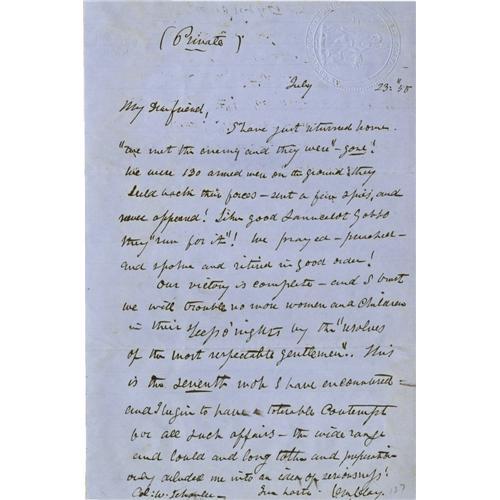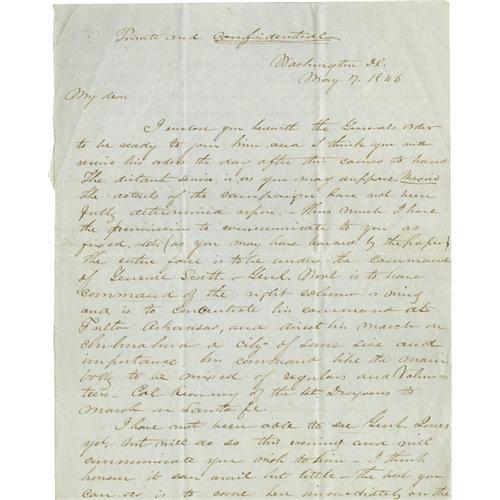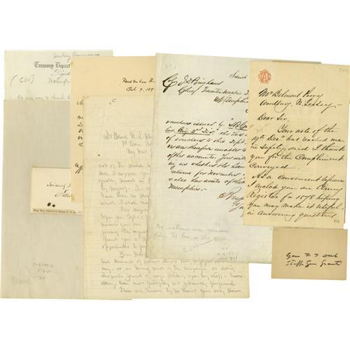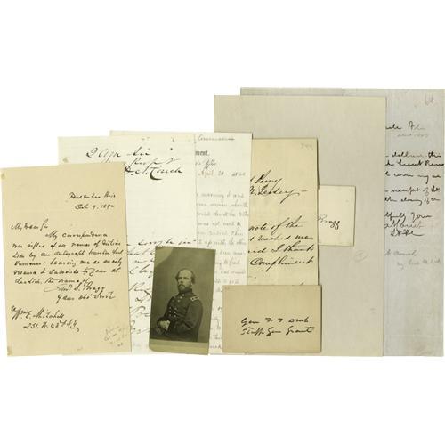 <B>Union Generals</B></I> A good collection of 12 pieces consisting of letters, documents and clipped signatures of Civil War Union generals. Includes <B>Cassius M. Clay</B></I> A.L.S. White Hall, Kentucky, July 5, 1895 concerning "<I>...my recall by Seward in 1862... Seward introduced the corrupt Albany politics into Washington... the notorious Lobbyists - Green Adams & Co. Swelled Perkins' Swindle from a few thousands to hundreds of thousands- but did not fine an ally in me... I am now universally seen to be the Annexor of Alaska!</B></I>". Together with an A.L.S. no place , July 23, 1855; <B>Irwin McDowell,</B></I> A.L.S. Washington, May 17, 1846 to his son to his son: "<I>I enclose you herewith the General's Order to be ready to join hem and I think you will receive his orders the day after this comes to hand. The distant service, is, as you may suppose, Mexico. The details of the campaign have not been fully determined upon...The entire force is to be under the command of General Scott -- Genl. Wool is to have command of the right column or wing... and direct his march on Chihuahua a city of some size and importance... Col. Kearney of the 1st Dragoons to march on Santa Fe...</B></I>"; <B>G. A. DeRussey</B></I> A.L.S. Fort Hamilton, January 3, 1780; <B>F. T. Dent</B></I> Signature on a card adding "<I>Staff Genl. Grant</B></I>"; <B>Henry M. Devin</B></I> A.L.S. St. Louis, January 24, 1864; <B>Henry L. Abbot</B></I> A.L.S. Broadway Landing, Virginia, November 21, 1864; <B>Edward S. Bragg</B></I> A.L.S. Fond du Lac, Wisconsin, October 9, 1892. Together with a signature on a 3.5 x 2 inch card; <B>L. E. Chittenden</B></I> A.L.S. Washington, April 24, 1864 relating a touching incident involving an old woman from Ohio wandering Washington looking for her sick soldier son; <B>Darius N. Couch</B></I> A.N.S. signed twice sending his autograph. Together with an A.L.S. Pensacola, Florida, circa 1847 . Together twelve pieces in very good to fine condition. Should be viewed. <I>From the Henry E. Luhrs Collection.</B></I><BR><BR><b>Shipping:</b> Small Flat (<a target="_blank" href="http://www.heritageauctions.com/common/shipping.php">view shipping information</a>)
