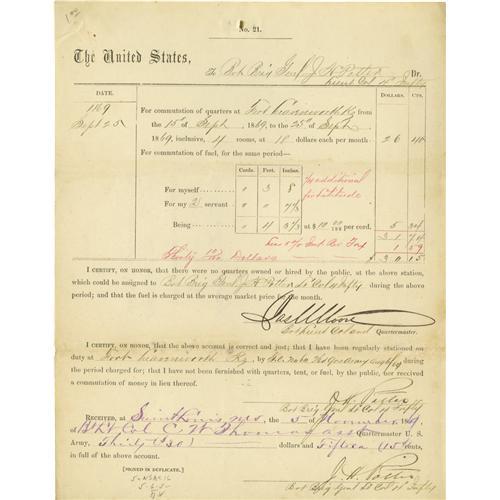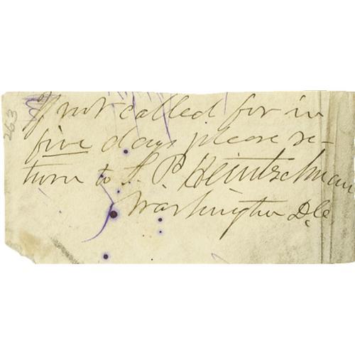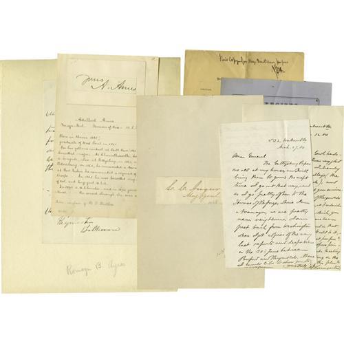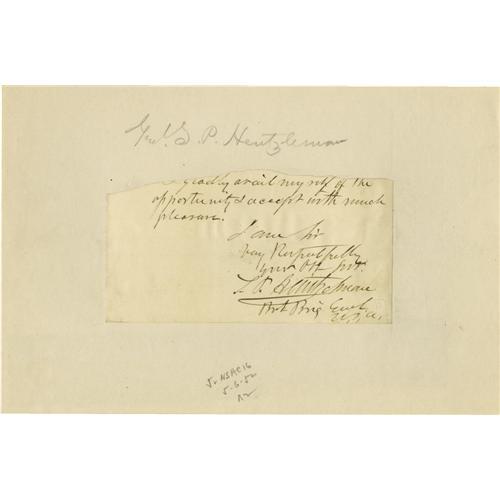 <B>Union Generals</B></I> A good collection of 16 pieces consisting of letters, documents and clipped signatures of Civil War Union generals. Includes <B>Sameul P. Heintzelman</B></I> A.N.S. being his return on a small slip removed from an envelope. Together with his signature on the bottom portion of a letter adding rank "<I>Bvt Brig Genl U.S.A.</B></I>"; <B>Winfield Scott Hancock</B></I> mounted signature adding rank, 1866; <B>Joseph H. Potter</B></I> D.S. November 5, 1869; <B>J.S. Rosengarten,</B></I> A.L.S., Philadelphia , March 27, 18 80 to General Hoffman: "<I>...the Gettysburg papers are all at my house, and I'll bring them to you next time I go out that way...</B></I>". Together with a second A.L.S. Philadelphia , March 12, 18 80 to General Hoffman noting possession of reports "<I>...of Reynold' command in the Peninsula, at Fredericksburg and Chancellorsville, which you may like to look over...</B></I>"; "<B>C. C. Augur</B></I> signature adding rank. <I>Mounted</B></I>; <B>Albert Ames</B></I> mounted signature on a manuscript biography of Ames; <B>Romeyn B. Ayres</B></I> A.L.S., Winchester, November 15, 1865. <I>Mounted to a larger sheet</B></I>; <B>J. W. Hoffman</B></I> A.N.S. on the top of a pamphlet, 1872; <B>John A. Dix</B></I> A.L.S. Washington, July 29, 1848 to Erastus Corning; <B>T. Drayton</B></I> L.S. Washington, May 27, 1865; <B>W. W. Duffield</B></I> "<I>In camp on Cumberland River,</B></I> August 1, 1884; <B>Drake De Kay</B></I> his typically enormous signature on a D.S., Washington, July 3, 1861, the verso bears an endorsement by <B>Cyrus W. Field</B></I>; <B>J. Watts de Peyster Jr.</B></I> A.L.S. Albany, N.Y., February 6, 1885. Together sixteen pieces in very good to fine condition. Should be viewed. <I>From the Henry E. Luhrs Collection.</B></I><BR><BR><b>Shipping:</b> Small Flat (<a target="_blank" href="http://www.heritageauctions.com/common/shipping.php">view shipping information</a>)