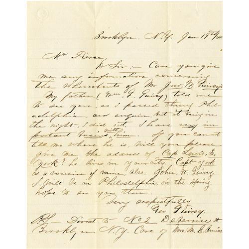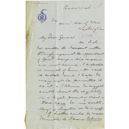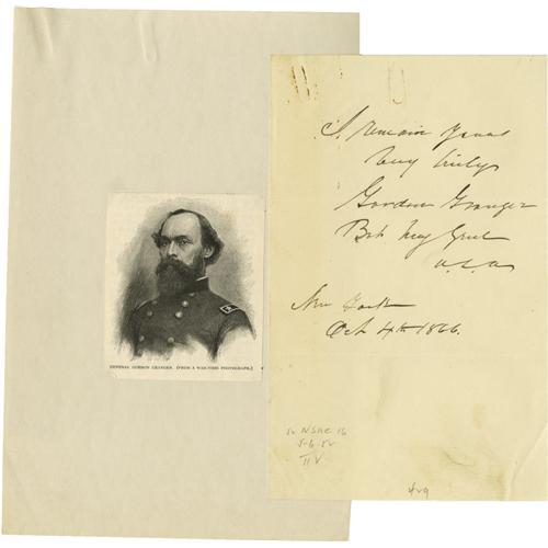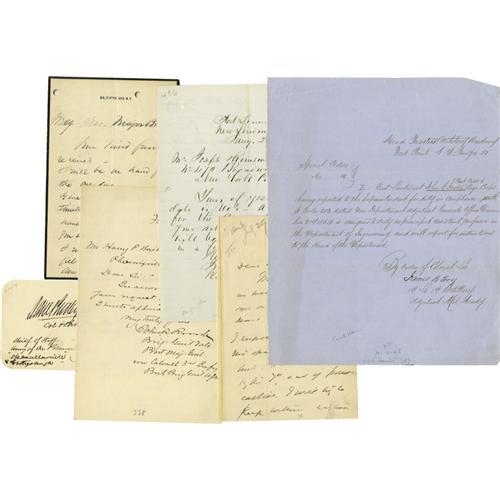 <B>Union Generals</B></I> A good collection of 15 pieces consisting of letters and documents signed by Civil War Union generals. Includes: <B>Daniel Sickles</B></I> A.L.S. New York, Janaury8, 1893 to Governor Boutwell, concerning the case of Admiral Franklin; <B>Daniel Butterfield</B></I> A.L.S. on mourning stationery, New York, no date , recommending speakers for a reunion. Together with a signature adding rank and "<I>Chancellorsville Gettysburgh</B></I>", 1863; <B>Rufus Ingalls</B></I> A.L.S., New York, July 17, 1874 to Secretary of War William Belknap complaining of Hamilton Fish's blocking Montgomery Meigs' nomination as Minister of Russia: "<I>...If Sickles could be made Minister to Spain before the Law of 1870, Genl. Meigs as a retired officer, certainly can now be appointed to Russia - Mr. Fish probably dislikes it because he did not suggest it, or wants a friend of his own sent there...</B></I>"; <B>Gordon Granger</B></I> signature with sentiment, 1866; <B>James B. Fry</B></I> L.S. West Point, January 11, 1855 ordering the appointment of John G. Foster as an assistant professor in the Department of Engineering; <B>Adam Badeu</B></I> A.L.S. Tannersville, July 27, 1885 ; <B>John N. Brannan</B></I> A.L.S. New London, January 25, 1867; <B>John R. Brooke</B></I> A.N.S. Fort Shaw, February 4, 1888; <B>Henry B. Carrington</B></I> A.N.S. Crawfordsville, June 12, 1880; <B>John B. Carr</B></I> A.L.S. Troy, April 26, 1876 accepting thre resignation of Colonel Joseph Egolf and honoring his service; <B>Robert G. Harper</B></I> A.L.S. March, 27, 1824; <B>William S. Smith</B></I> A.L.S. Cincinnati, May 17, 1862; <B>John de Courcy</B></I> A.L.S. Lexington, Kentucky, January 23, 1864, "<I>...I believe you have been made acquainted with the harsh treatment I received from General Burnside on the 9th of Sept last when I entered Cumberland Gap, with my command from the Kentucky side, some hours before he did, with his troops from the Tennessee side... I made complaint three months ago, and again on the 3rd Inst.... but as yet no notice has been taken... And when I remember the pranks played by Brigadiers, and Major Generals, who to save their lives could not have told me in technical terms the difference between a Column 'left' or one 'right in front' - I now not - cannot understand why the enemy has not succeeded continuously...</B></I>"; <B>George Guiney</B></I> A.L.S. New York, January 19, 1865. Together, fifteen pieces in very good to very fine condition. <I>From the Henry E. Luhrs Collection.</B></I><BR><BR><b>Shipping:</b> Small Flat (<a target="_blank" href="http://www.heritageauctions.com/common/shipping.php">view shipping information</a>)