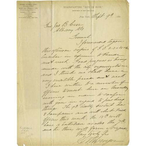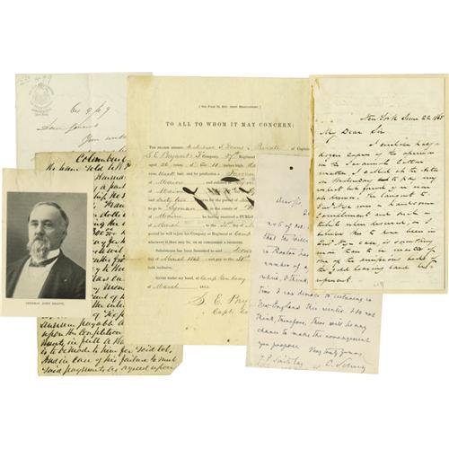 <B>Civil War Union Generals and Officers Autograph Collection</B></I> consisting of the following items: <BR><B>Stephen Van Remsaeller Cruger</B></I>- 1880 ALS in Headquarters "Boys in Blue" letterhead. <BR><B>Samuel Wylie Crawford</B></I>- ALS, no date, written from th Colonnade Hotel. <BR><B>Carl Schurz</B></I>- 1875 ALS, New York. <BR><B>Silas Casey and Drake De Kay</B></I>- 1863 furlough request DS. <BR><B>John Beaty</B></I>- 1884 ALS, Columbus, Ohio (includes period engraving). <BR><B>John Gross Barnard</B></I>- Two ALsS, 1869 and 1874, on Board of Engineers, Army Building, New York letterheads. <BR><B>William Farquhar Barry</B></I>- July 1865 ALS, Buffalo, New York. <BR><B>Stephen Vincent Benet</B></I>- Two 1888 Signatures with rank. <BR><B>Henry Harrison Bingham</B></I>- Clipped Signature. <BR><B>Louis Blenker</B></I>- 1862 LS on "Blenker's Division Head-Quarters" letterhead. <BR><B>Oliver Otis Howard</B></I>- 1888 ALS on Office Commanding General, Fort Mason letterhead. <BR>Also included are the following miscellaneous period items: Samuel Sullivan Cox (1865 ALS); Charles P. Daly (1865 ALS); August Belmont (1863 ALS); and William W. Hoppin (1866 ALS). Sixteen items total. Overall fine condition, most include typed transcripts. <I>From the Henry E. Luhrs Collection.</B></I><BR><BR><b>Shipping:</b> Small Flat (<a target="_blank" href="http://www.heritageauctions.com/common/shipping.php">view shipping information</a>)