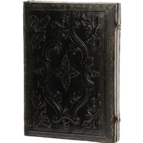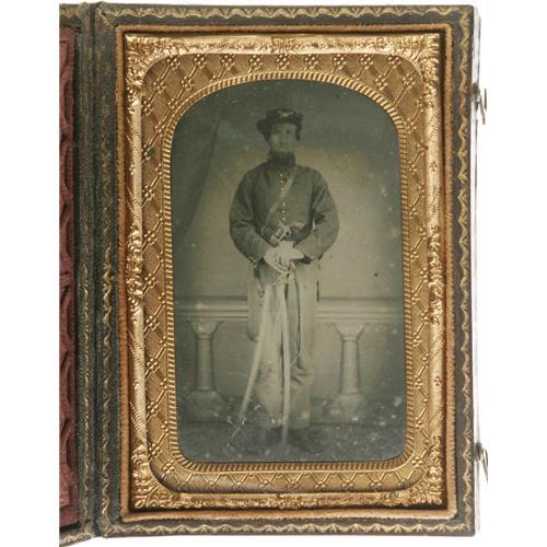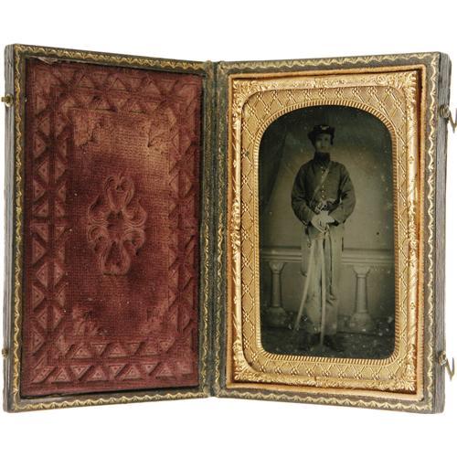 <B>Civil War Union Soldier Tintype in a Union Case</B></I> under glass with a brass shell mat, 2.5" x 3.75". This gentleman with the interesting set of chin whiskers looks like he's ready for battle holding a M1860 (model 1860) cavalry sabre and with a Remington (or Remington look-alike) pistol in his belt. His uniform is standard Federal cavalry trooper attire with a Hardee hat. He is posed (a bit stiffly) in a studio in front of a railing and the photographer has added a bit of color to the photo with some gold leaf on the buttons, sleeve trim, and hat emblem. The condition is fine save for some crazing in what looks like a clear lacquer coating. The leather-covered wooden case is near excellent with the double hinges present and functional.