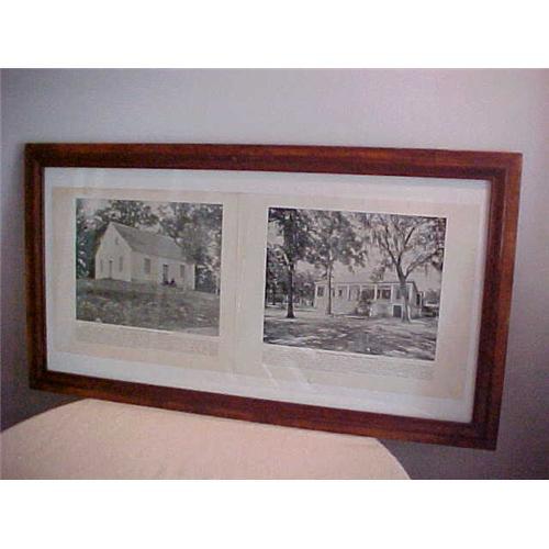 Prints, Civil War Vintage; Hone of Jefferson Davis, La. and Old Dunkards Church,Antietam, Md., Circa late 1800's, framed in a 16.50 X 30.50 oak frame; History of each print under print