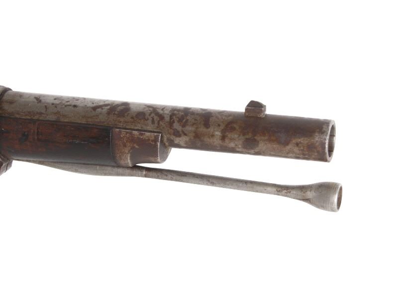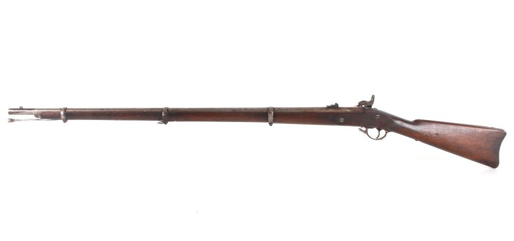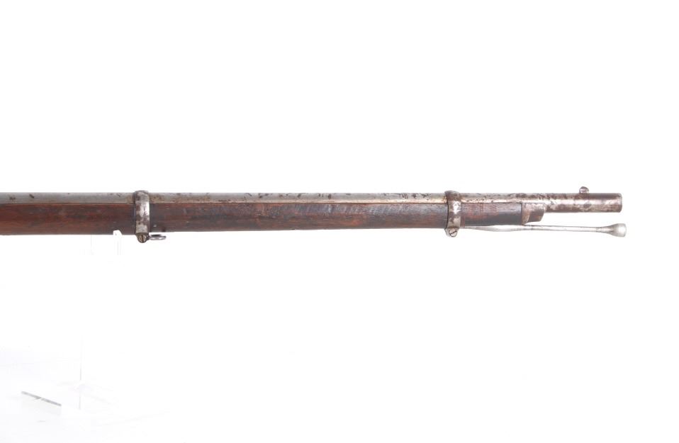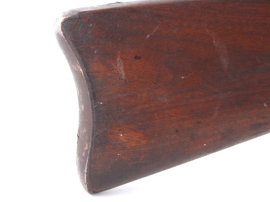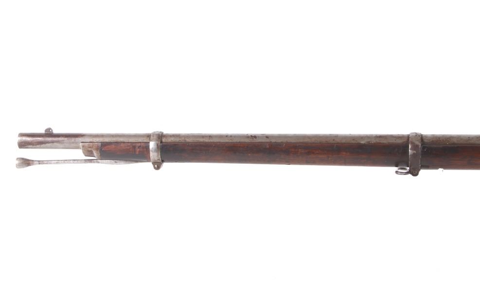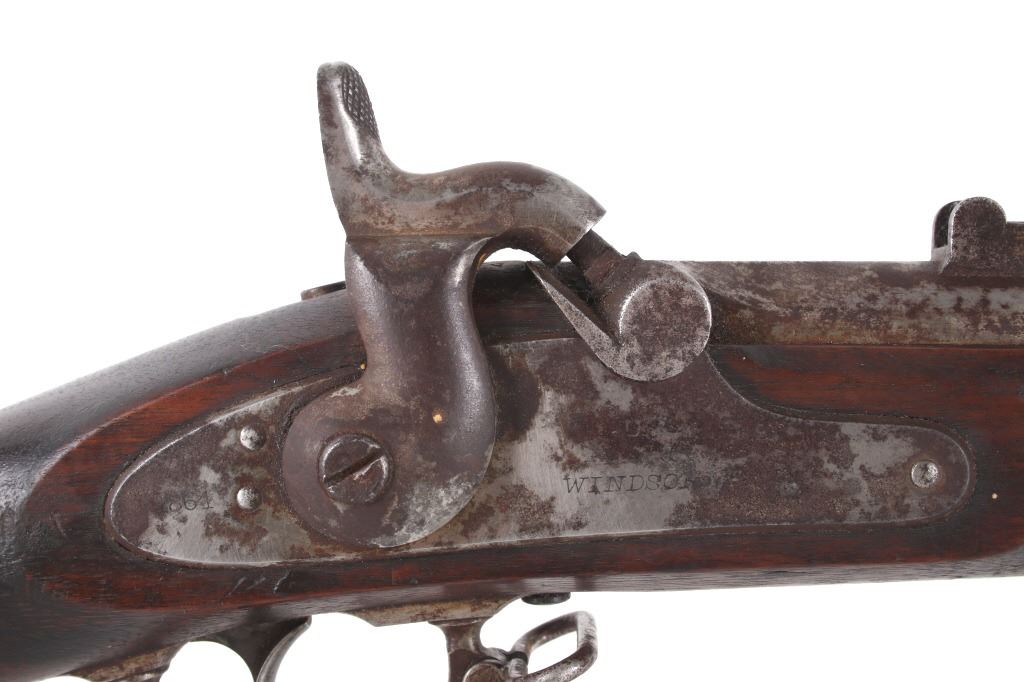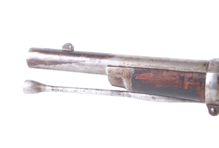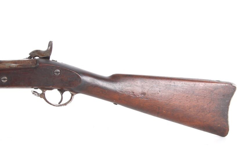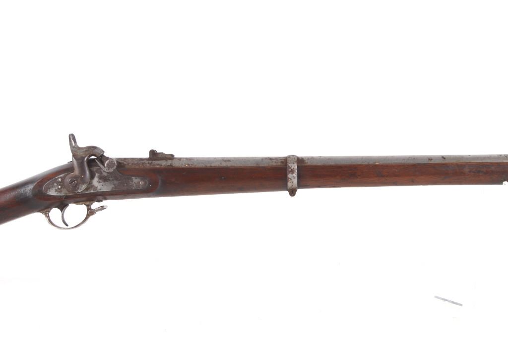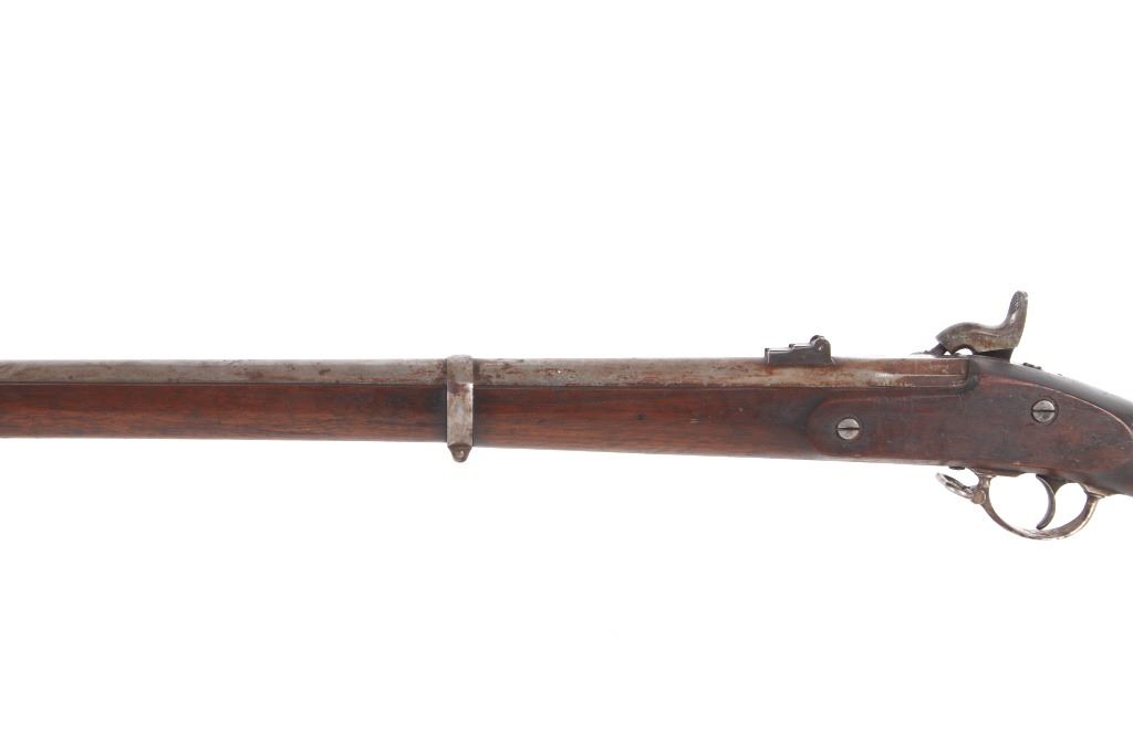 In this lot is a Civil War issued Special Model 1861, Contract Rifle-Musket. This is a classic .58 caliber rifled musket adapted to the hollow base “Minnie-Ball” used during the Civil War to great effect. The Special Model 1861 was designed by Colt as an improvement over the standard issue Model 1861. The main difference is in the more graceful hammer and lock design. The 40” rifled barrel utilized the above named hollow base bullet. This was a huge advancement over the previous smooth bore models using round balls. The conical bullet used in this rifle was slightly undersized for easy ramming over a charge of black powder. Upon firing, the explosion and expanding gases caused the hollow portion of the soft lead bullet to expand into the rifling which gave the projectile a rotational spin. Such a bullet fired in this manner was extremely accurate over several hundred yards and hit with devastating results. The metal parts of these fine rifles were finished “in the white,” which means they were not blued but left