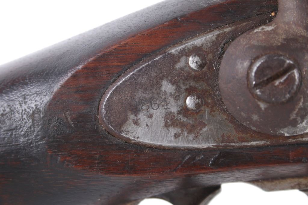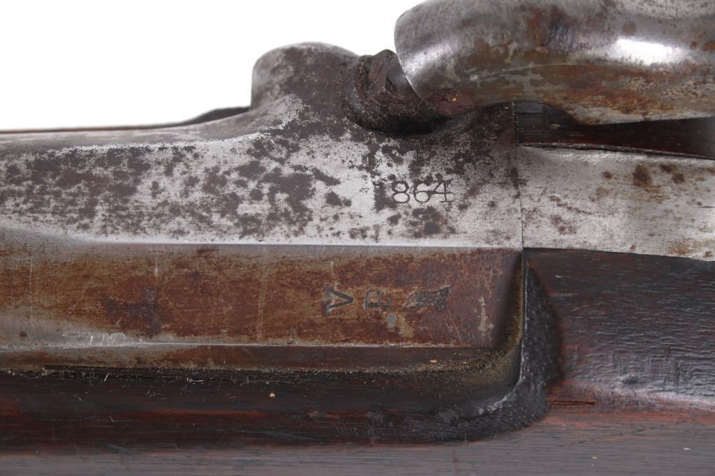 bright. This example still retains a good portion of this bright metal that is mixing with a brownish patina from age. As these rifles were “contracted out” to several makers, before being accepted by government inspectors, lock plates may show one of several makers or contractors. This example is stamped on the lock plate with the correct, three line marking of “U.S.” over “L. G. & Y.” over “Windsor, Vt.” The rear of the lock plate is dated 1864 as is the top breech portion of the barrel. The rear of the barrel is also stamped with the correct eagle head and VP firing and inspection proof marks. The markings on the lock plate indicate that this fine rifle was made by the Lamson, Goodnow & Yale