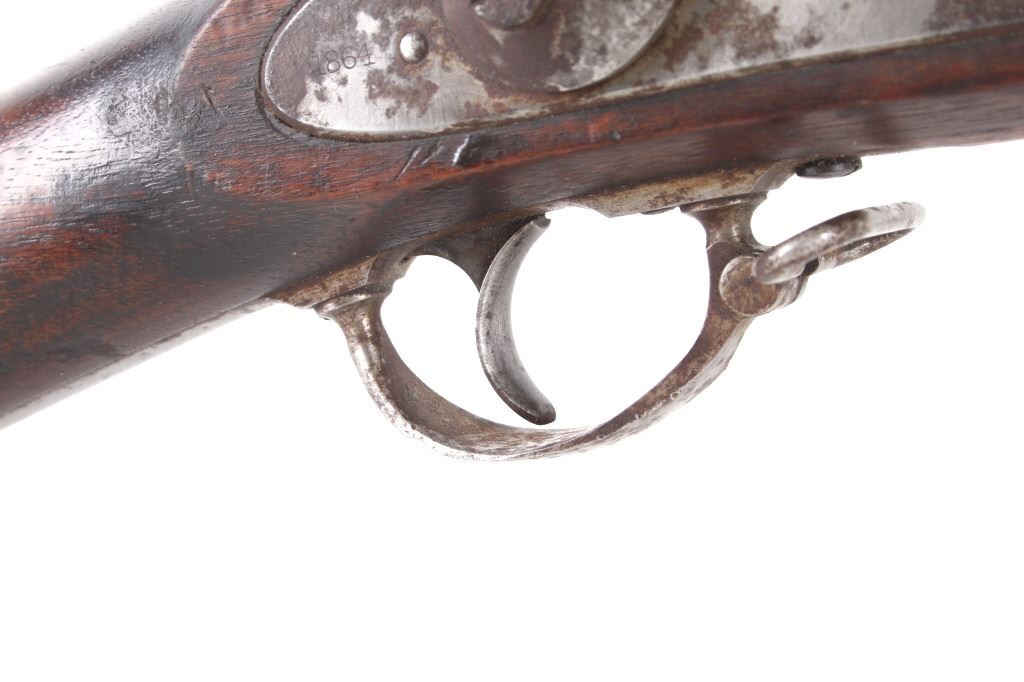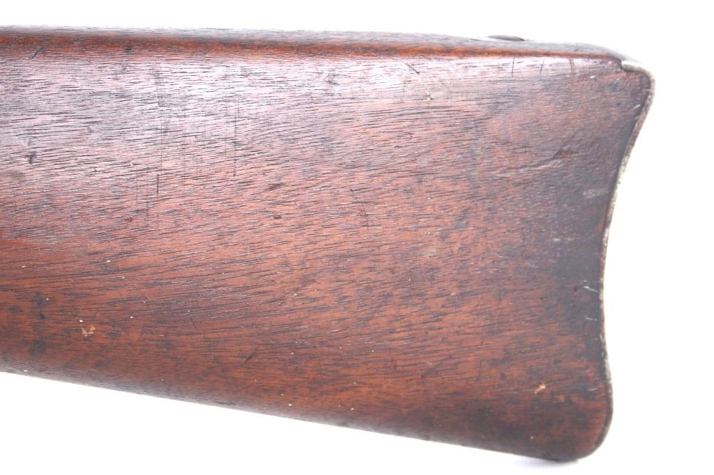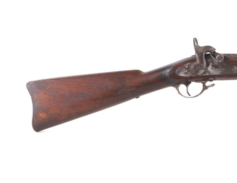 Union Army between 1862-1864. The lock plate, hammer and breech show mottled brown staining from age and use, yet retain full markings and an action as positive today as it was when issued during the Civil War. The bore has been inspected with a thin drop-in light to reveal a bright excellent bore with sharp rifling from end to end. Any roughness or corrosion is minimal and would probably clean out with a bronze cleaning brush. The stock and forearm are in fine condition showing no indication of being sanded or even cleaned and reveal only normal handling marks that one would expect from such an historical 158 year-old firearm. Importantly, the left side of the stock, opposite the lock plate, displays a crisp inspection cartouche which indicates this stock is original and not a replacement (which would not have an inspection cartouche stamping). The steel butt plate is correctly “U.S.” stamped and the correctly blued rear sight retains all three elevation sighting leaves- these are often broken off or missing. It is interesting to note that after the Civil War, many, if not most of these powerful and accurate rifles were sold as surplus to settlers heading West. The .58 caliber bullets fired by these rifles had more than enough power for the large game encountered west of the Mississippi River. They could also be counted on for self-protection if necessary. One need only hold this rifle-musket to feel the history in it! An American classic worthy of any fine Civil War or Old West collection. This one turned up right here in Montana. This firearm qualifies as an antique, and it does not require FFL Transfer or NICS Background Check.*
