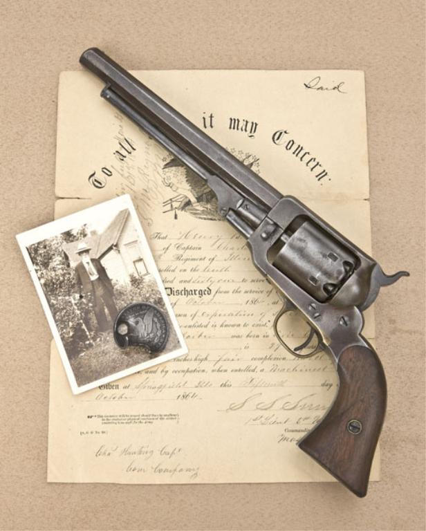 Civil War associated Whitney Navy Model percussion revolver, .36 cal., 7-1/2” octagon barrel, blue finish, wood grips, #5348. This gun descended thru the family of Henry B. Barber, with original Civil War dischargepaper, old photo of Barber in front of a house in his later life and an 1884 U.S. Morgan silver dollar with two bullet holes that by family tradition was shot by Henry with this revolver to demonstrate hismarksmanship years after the War. Barber was an enlisted man with Company A, 7th Illinois Cavalry Regiment; he enrolled in the unit on August 10, 1861 and was honorably discharged on October 15, 1864. This gun is in overallvery good condition showing an even brown patina on metal surfaces and shows holster wear on the left muzzle and some scattered pitting confined primarily to the firing areas; very good bore, crisp action, sharpmarkings, brass trigger guard, very good grips showing an old arch compression on the left grip with some mars at the bottom of the grips. Accompanied by a binder of information on Barber and the 7th Illinois
