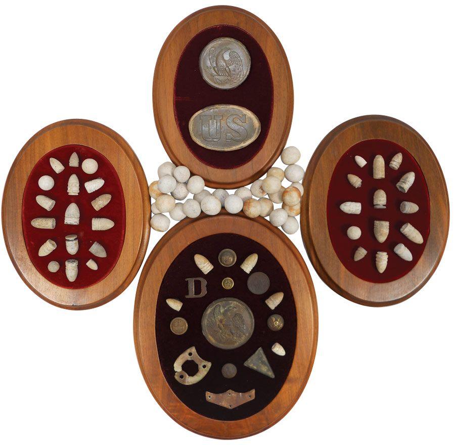 Civil War dug artifacts, 4 framed displays w/many relics, includes bullets, belt buckle, badges, buttons, coin, etc., c.1800's era, Good to VG as-found cond.