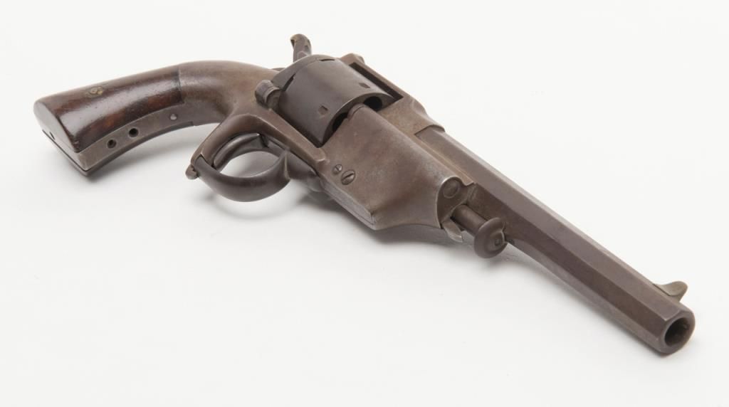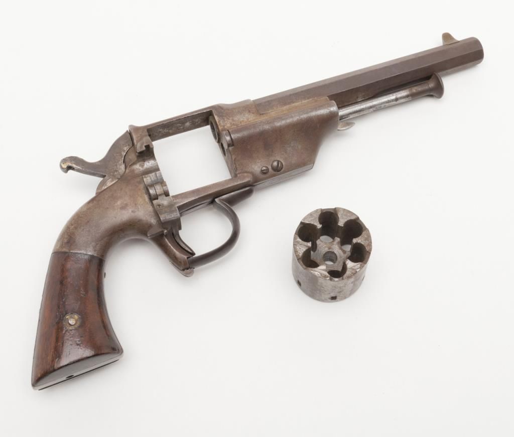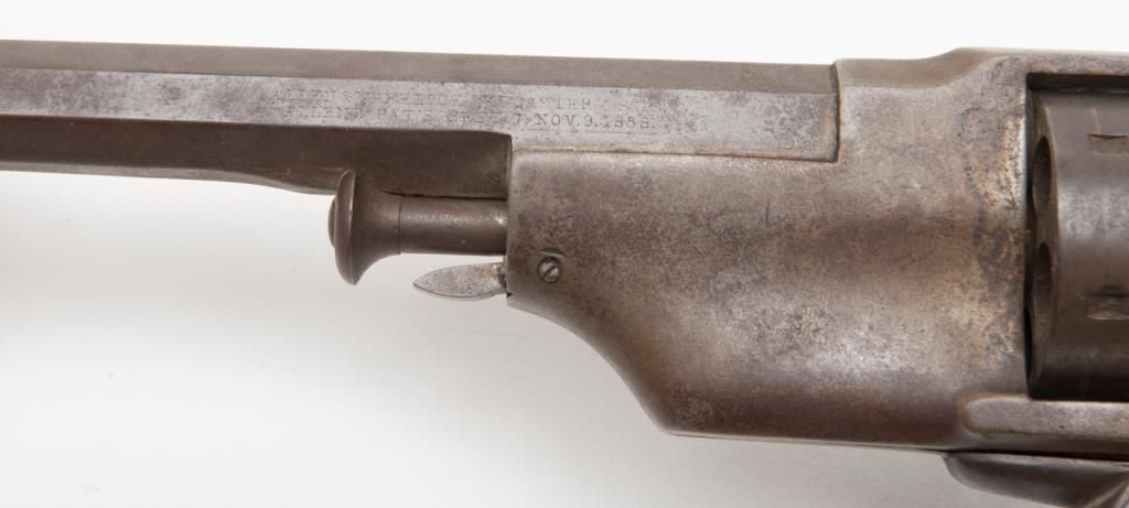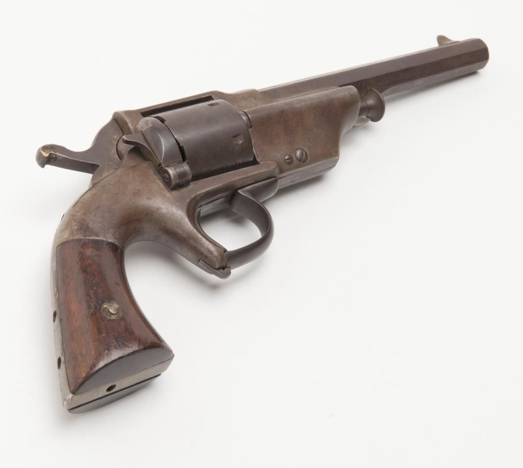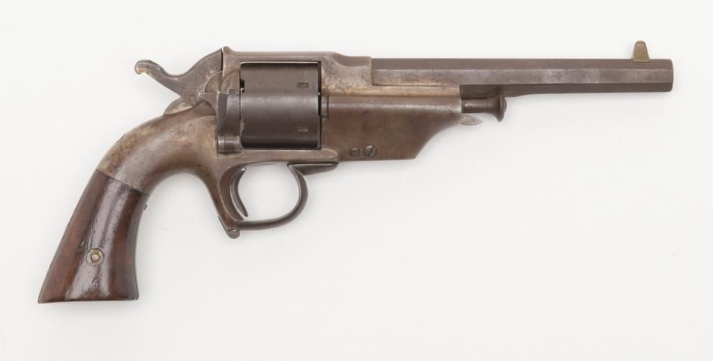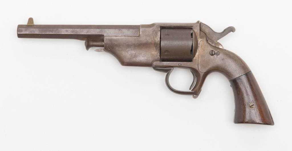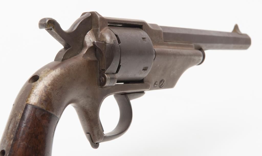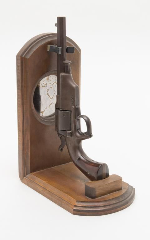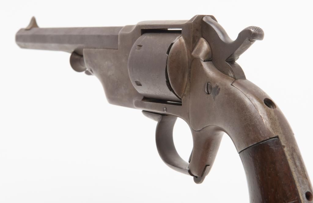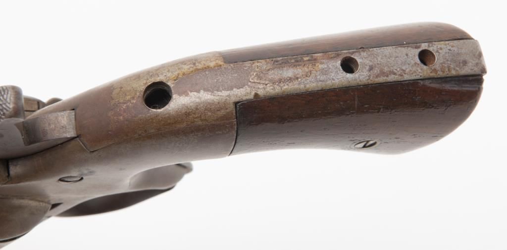 Civil War era Allen and Wheelock Lip fire revolver with inside of cylinder and backstrap drilled out; for display only; brown patina, wood grips, with wood display stand. (Antique). Est.: $150-$300.
