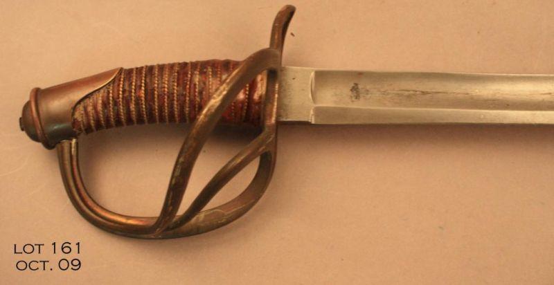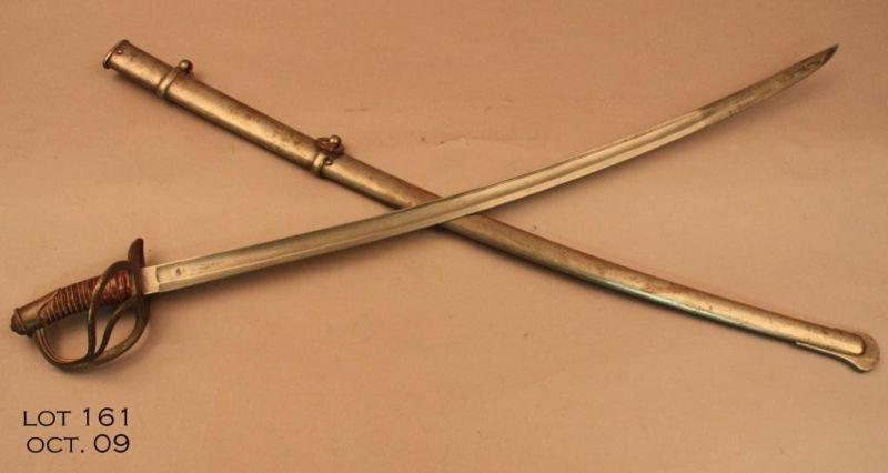 Civil War era European import sword and scabbard, approx. 44” overall, “Soligen” marked blade. This sword and metal scabbard are in overall good condition with the brass guard and pommel showing a nice dark patina and the grips showingconsiderable original leather wrap and wire with an old coating of clear rubber at the base of the grip to keep the wire from unraveling. The scabbard is complete and retains its two hanging rings. Est.: $150-$250.