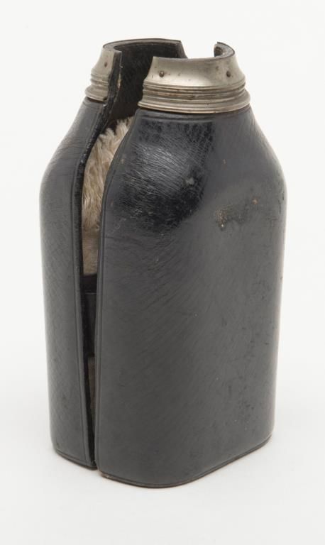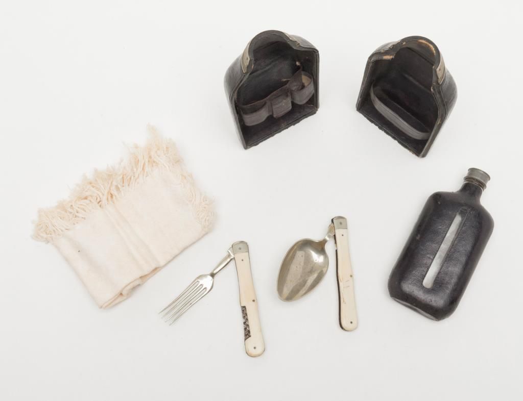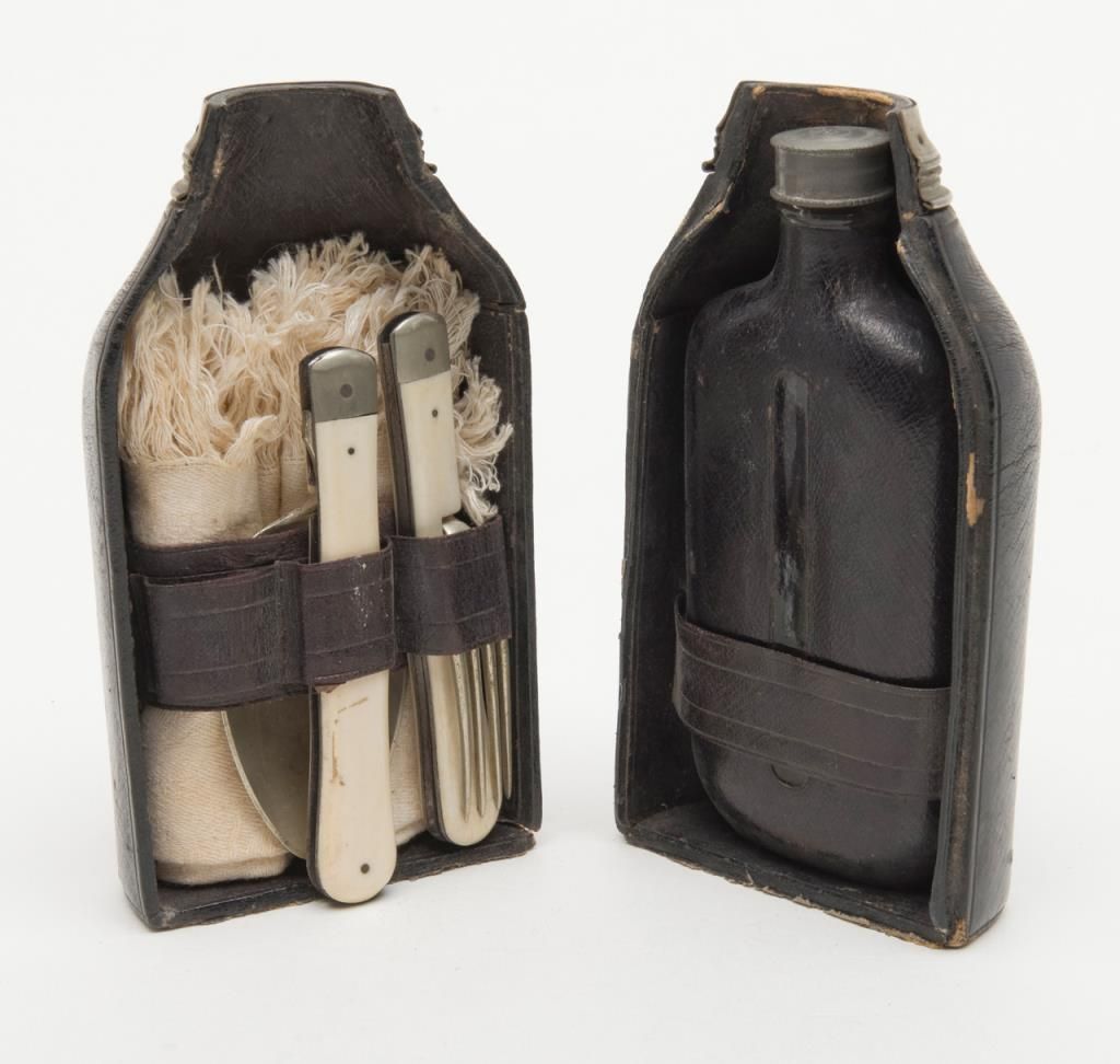 Civil War era Officer’s field eating utensil kit consisting of a leather covered glass flask with pewter screw-on cap, bone gripped folding spoon and folding fork (folding knife missing), plus linen napkin, all contained in a two-piece leather covered casing (screw-on lid to outer casing missing); overall very good condition. Est.: $150-$300.