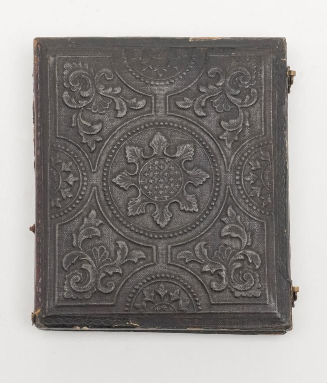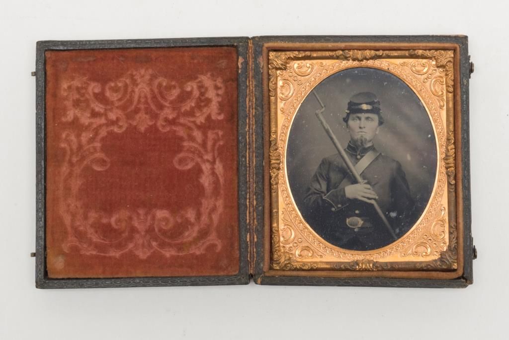 Civil War era image in case of Union soldier holding rifle with bayonet in very good condition overall. Est.: $250-$500.
