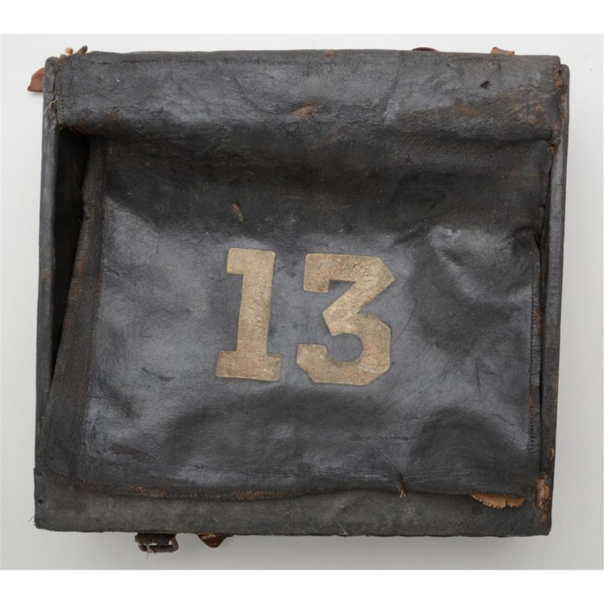 Civil War era leather and canvas over wood knapsack in overall fair condition showing a “13” on the cover flap in white (rest of cover is black in color); wear, scuffing and scattered damage due to age and storage;partial strap hardware remains; interior shows copper or brass rivets. Est.: $100-$200.
