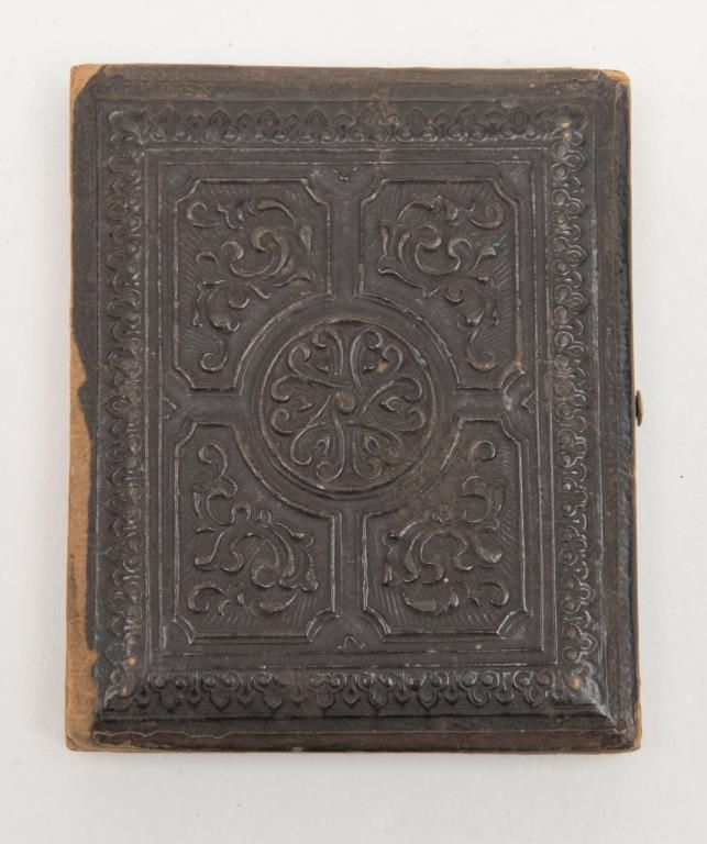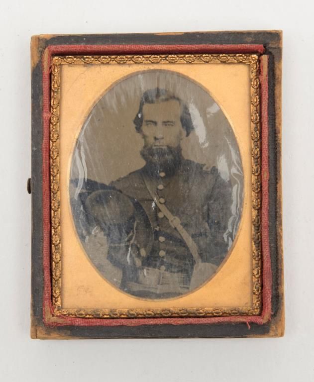 Civil War era small image in half case of Union officer holding his brim hat with braid and feather, in overall good to very good condition. Est.: $100-$300.