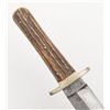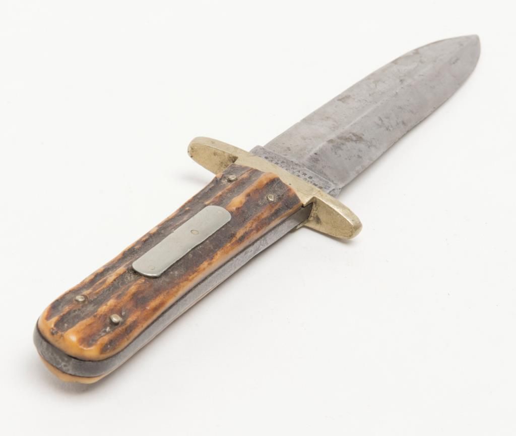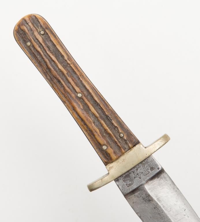 Civil War-era spear point dirk knife marked “U S” with a star between the letters by Edward Barnes and Sons, approx. 10” overall with a 6” blade in overall good condition with stag scales. Est.: $200-$400.