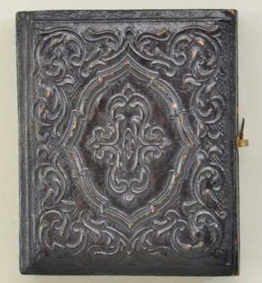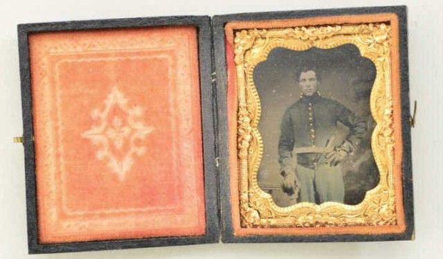 Civil War era tin type of young Union Cavalry trooper wearing gauntlets with English type bowie knife in belt around his waist. The image measures approx. 2-1/2" by 2". The image has been a period enhanced with goldpainted buttons. The condition is very good and contained within its original embossed leather case. Est.;$300-$600.