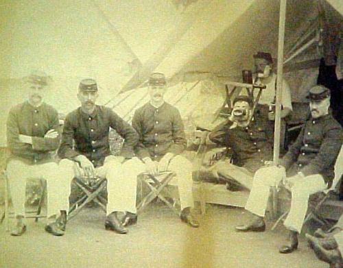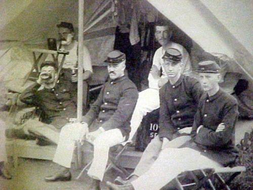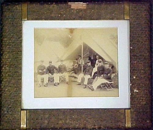 Civil War soldiers encampment group photo in gilt frame; image measures 7 1/2" x 9" (discoloration to photo and damage to top and right side of frame)