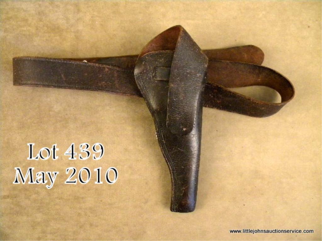 Civil War to Indian Wars era unmarked leather flap holster and belt with the holster appearing to be for a Colt 1849 pocket model percussion revolver with a 6” barrel in overall good condition. The holster has a riveted belt loop and a sewn flaploop on the top front of the holster; the belt is approx. 1-1/2” wide, unadorned and with a black painted square metal buckle; some slight crazing to top layer of leather but both the holster and belt are complete. From the estate of C.W.Slagle. Est.: $100-$200.