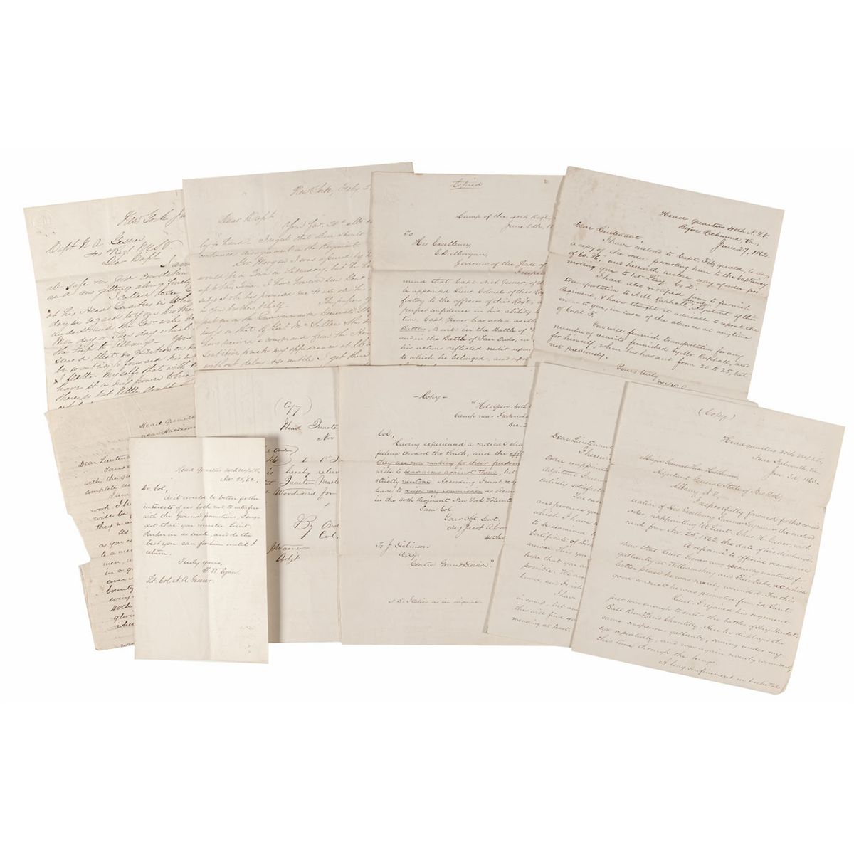 ALS,signed “T. W. Egan,” as Colonel, 40th New York Volunteers, two pages, 7.75 x 9.75, Headquarters 40th N.Y.S.V., Near Falmouth, Va., January 6, 1863. Letter to Lt. Col. Nelson A. Gesner. In part, “Those charges are amounting to nothing. [Brig. Gen. David] Birney has quashed those of incompetency & calling him by a vile name…I have always regarded him as a friend until lately, & am sorry I was ever misled…That of introducing an improper female into my quarters is the most ungenerous. I did not think that any one claiming the title of an American gentleman would have so involved a woman who was absent in any question. But if he had the right to offer witnesses to impugn her character, so have I the right to call others to vindicate it, and with it my own…”