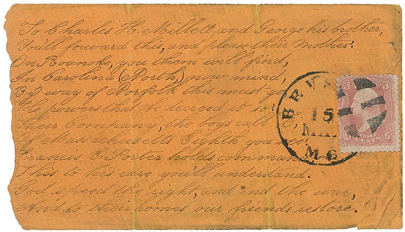Handwritten poem on a 5.25 x 3 envelope bearing an affixed three-cent George Washington stamp, canceled in Beverly, MA, circa 1862–3. In full: “To Charles H. Millett, and George his brother, / You’ll forward this, and please their mother; / On Roanoke, you there will find, / In Carolina (North) now mind, / By way of Norfolk this must go, The powers that be decreed it so, / Their Company, the boys call E, / If Massachusetts Eighth you see; / Francis E. Porter holds command, / This to his care you’ll understand. / God speed the right, and end the war, / And to their homes our friends restore.” In very good condition, with two vertical folds, light creasing and soiling, and a torn left edge from opening. Charles H. Millett (1843–1911) was mustered into Company E of the 8th Massachusetts on September 19, 1862, and mustered out August 7, 1863; George Millett (1842–1921) served in Company G of the 8th Massachusetts from September 1862 to April 1864.