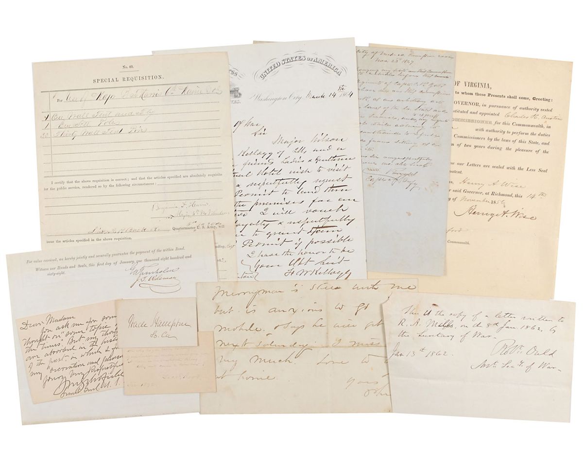 Collection of ten items, each signed by a notable Civil War figure, including: Philip H. Sheridan (ALS), Henry Wise (DS), John M. Schofield (ALS), Hiram Burnham (war-dated DS), Robert Ould (war-dated ANS), Daniel Ruggles (ALS), Wade Hampton (signature), Francis W. Kellogg (ALS), George A. Trenholm (DS), and George F. Root (AQS). In overall very good to fine condition. Individual descriptions are as follows: