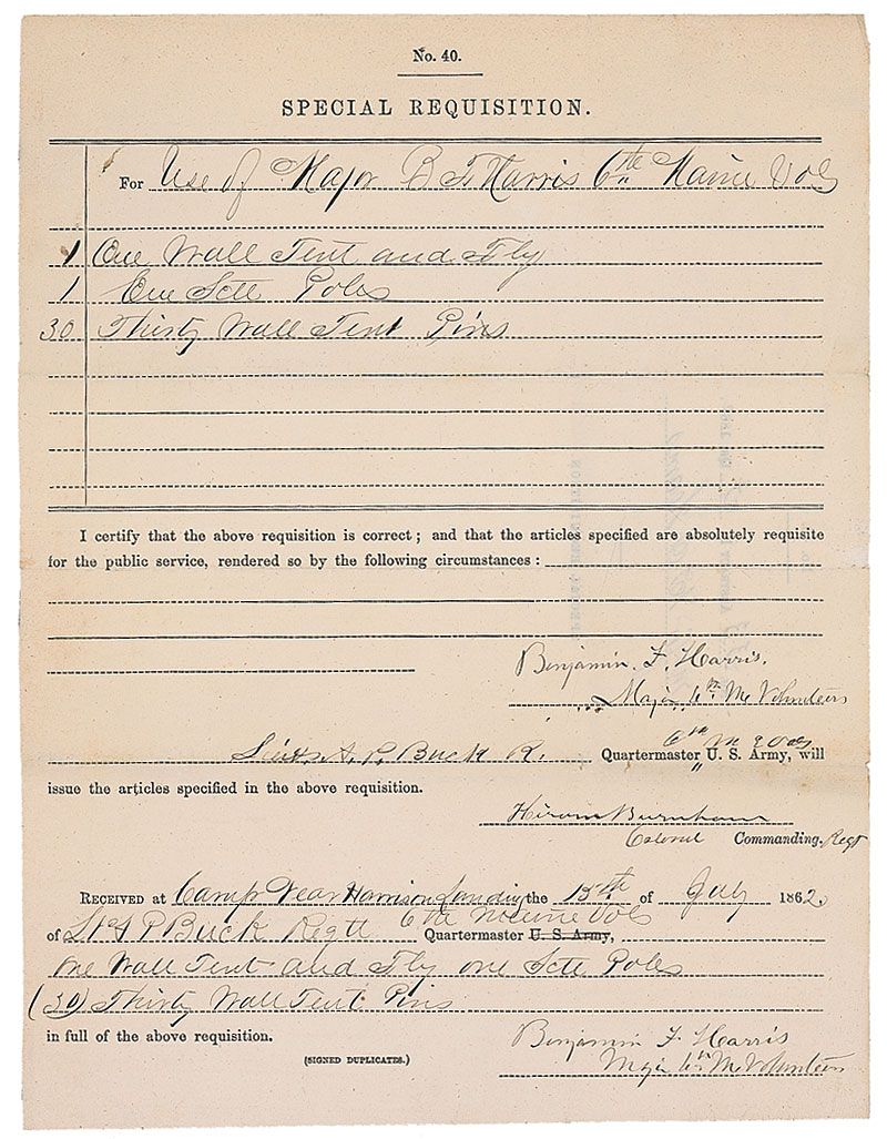 Hiram Burnham: Civil War–dated DS, one page, 7.75 x 10, July 15, 1862. Special requisition document for “One Wall Tent and Fly…One Sett Pole…Thirty Wall Tent Pins.” Signed at the conclusion by Burnham and countersigned by Benjamin F. Harris. In fine condition, with intersecting folds, some creases, and expected document wear.