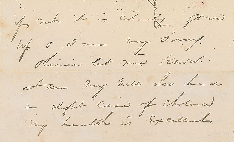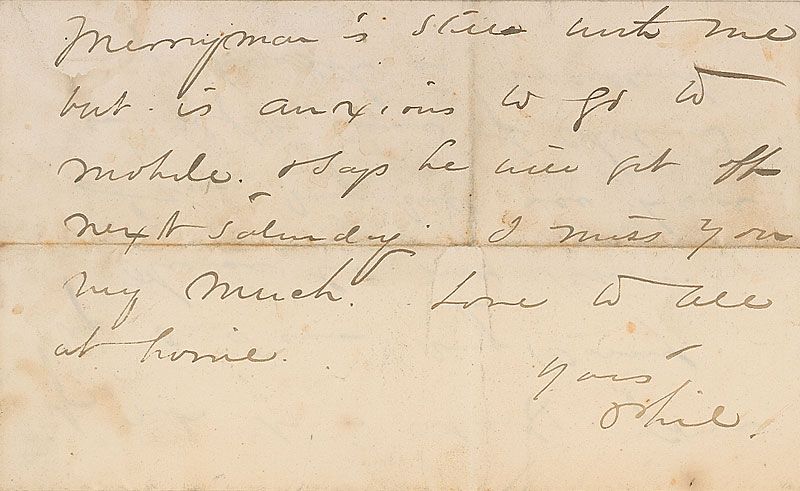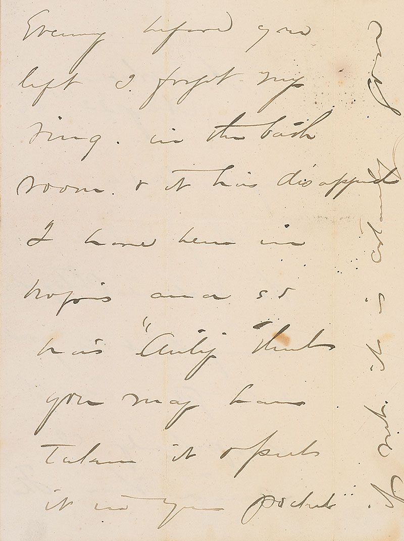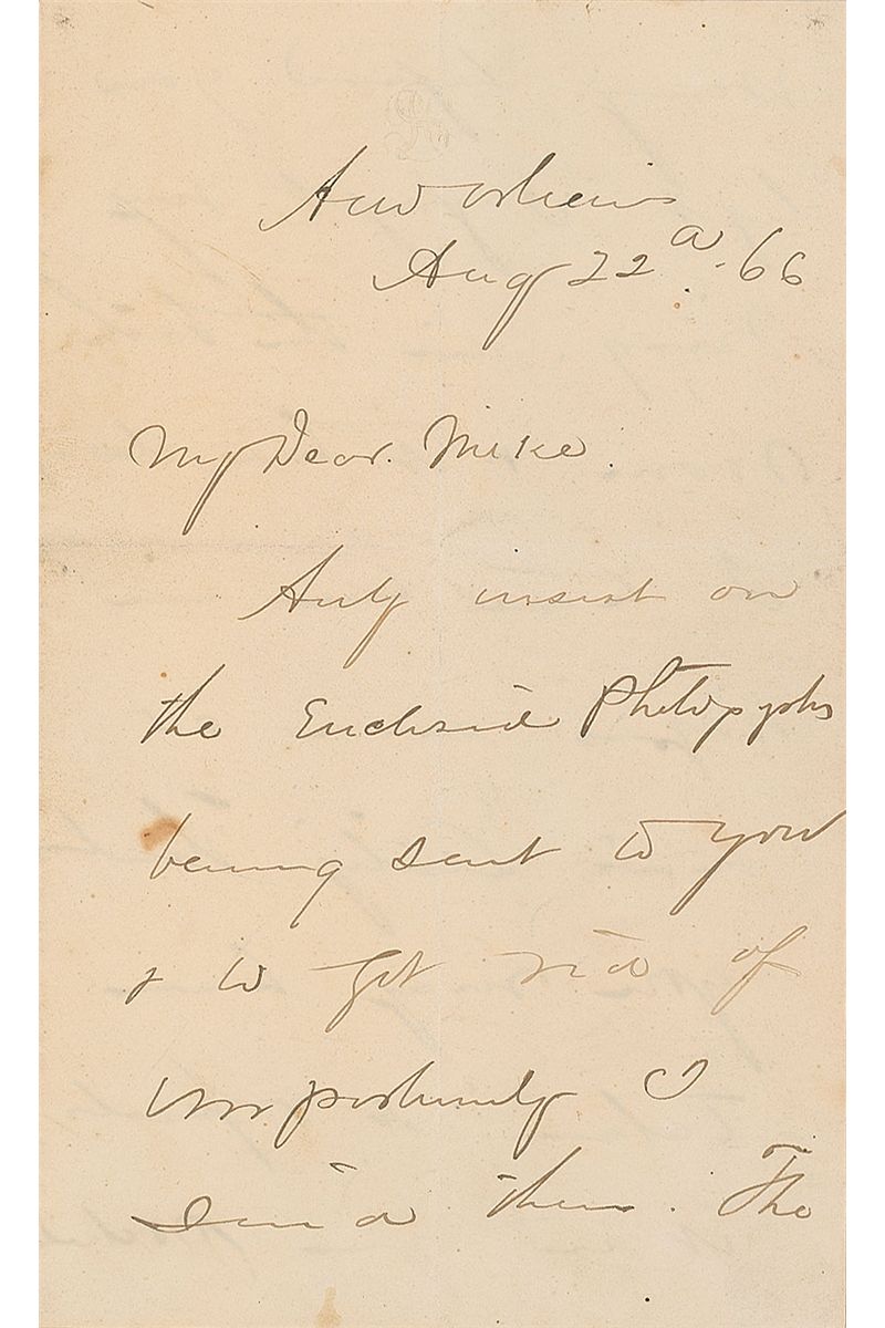 Philip H. Sheridan: ALS signed “Phil,” four pages on two adjoining sheets, 5.25 x 8.5, August 22, 1866, in part: “The evening before you left I forgot my ring in the bath room & it has disappeared…Andy thinks you may have taken it & put it in your pocket, if not…I am very sorry. Please let me know.” Central vertical and horizontal folds and light scattered soiling, otherwise fine condition.