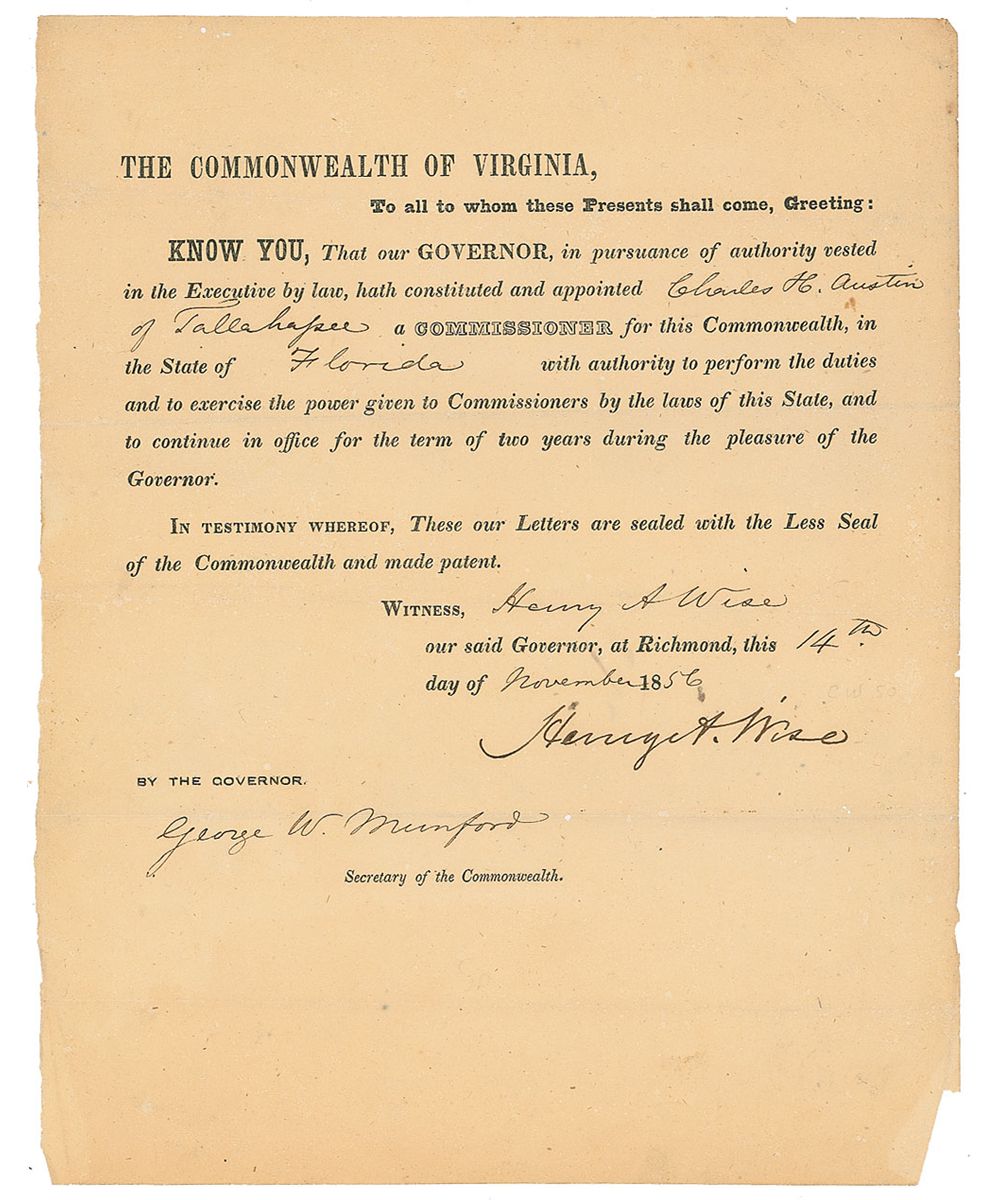 Henry Wise: Partly-printed DS, one page, 8 x 10, November 14, 1856, appointing Charles H. Austin “a Commissioner for this Commonwealth, in the State of Florida.” Signed at the conclusion by Wise and countersigned by Secretary George W. Mumford. In very good condition, with a couple of small pinholes along folds, paper loss to lower right edge, and a uniform shade of mild toning.