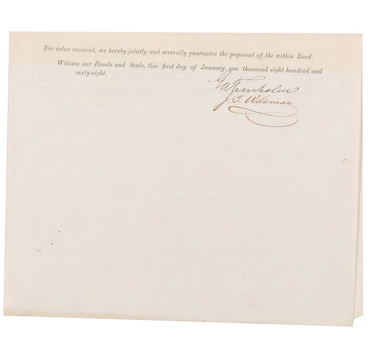 George A. Trenholm: Partly-printed DS, signed “G. A. Trenholm,” one page, 8.25 x 13.75, January 1, 1868. South Carolina merchant’s bond for $64.40, in which “Theodore D. Wagner and William L. Trenholm…are held and firmly bonded…under an agreement…in behalf of John Fraser and Company.” Signed at the conclusion by both Wagner and William Trenholm, with George A. Trenholm and James Walsman signing as witnesses on the reverse. In fine condition, with expected document wear.