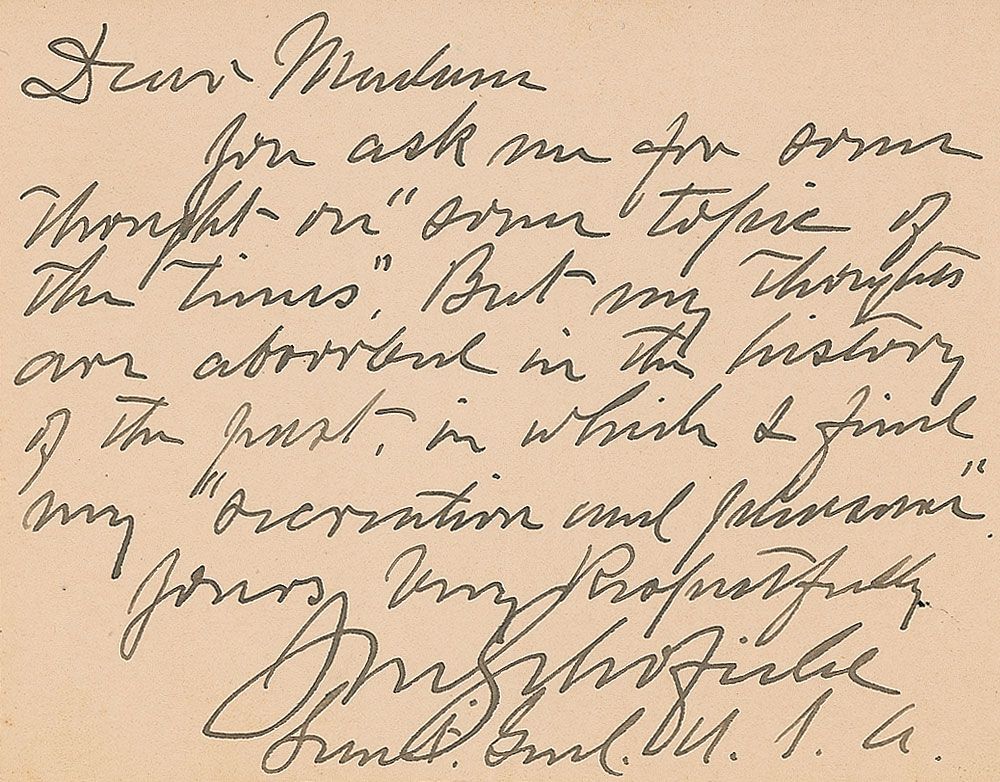 John M. Schofield: ALS signed “J. M. Schofield, Lieut. Genl. U. S. A.,” one page on a 4.25 x 3.5 card, no date, in full: “You ask for some thoughts on ‘some topic of the times.’ But my thoughts are absorbed in the history of the past, in which I find my ‘overreaction and pleasure.’” Addressed on the reverse in Schofield’s hand. In fine condition.