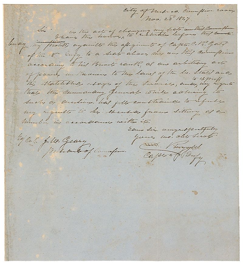 Daniel Ruggles: ALS signed “D. Ruggles, Capt’n Infy,” one page, 7.75 x 8.5, November 23, 1847. Letter to Colonel John M. Geary, in part: “I have the honor in the act of changing my seat to reiterate before this body, my protest against the assignment of Capt. C. R. Gold of the 8th Infy. to a seat above me on this commission according to his Brevet rank, as an arbitrary act of power unknown to the laws of the U. States, and the established usage of the service, and to express my regret that the Commanding General while adhering to such a decision, has felt constrained to refuse my request to be excused from sitting as a member in accordance with it.” In very good condition, with intersecting folds (one vertical fold passing through first letter of the signature), and scattered discoloration and soiling.