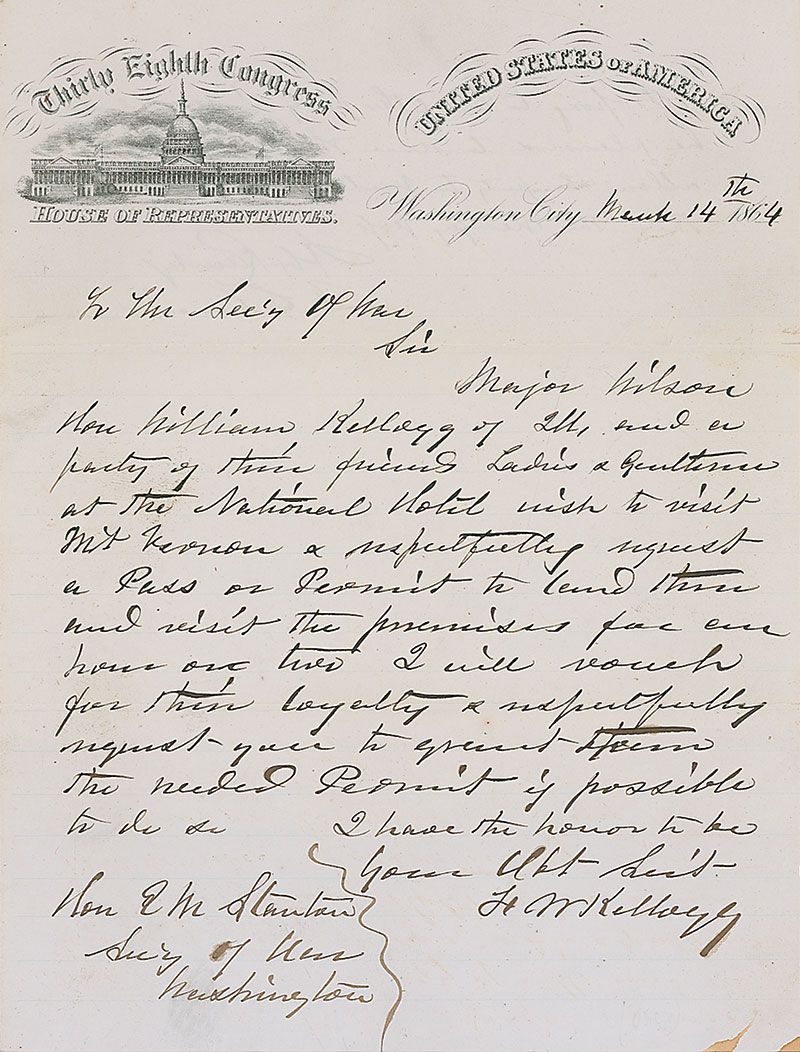 Francis W. Kellogg: ALS signed “F. W. Kellogg,” one page, lightly-lined, 7.75 x 10.25, congressional letterhead, March 14, 1864. Letter to Secretary of War Edwin M. Stanton, in part: “Major Wilson, Hon. William Kellogg of Ills., and a party of three friends…wish to visit Mt. Vernon & respectfully request a pass or permit to land there.” Also endorsed on the reverse by Alexander Ramsay and Zachariah Chandler. In fine condition, with a trivial stain to the lower right corner.