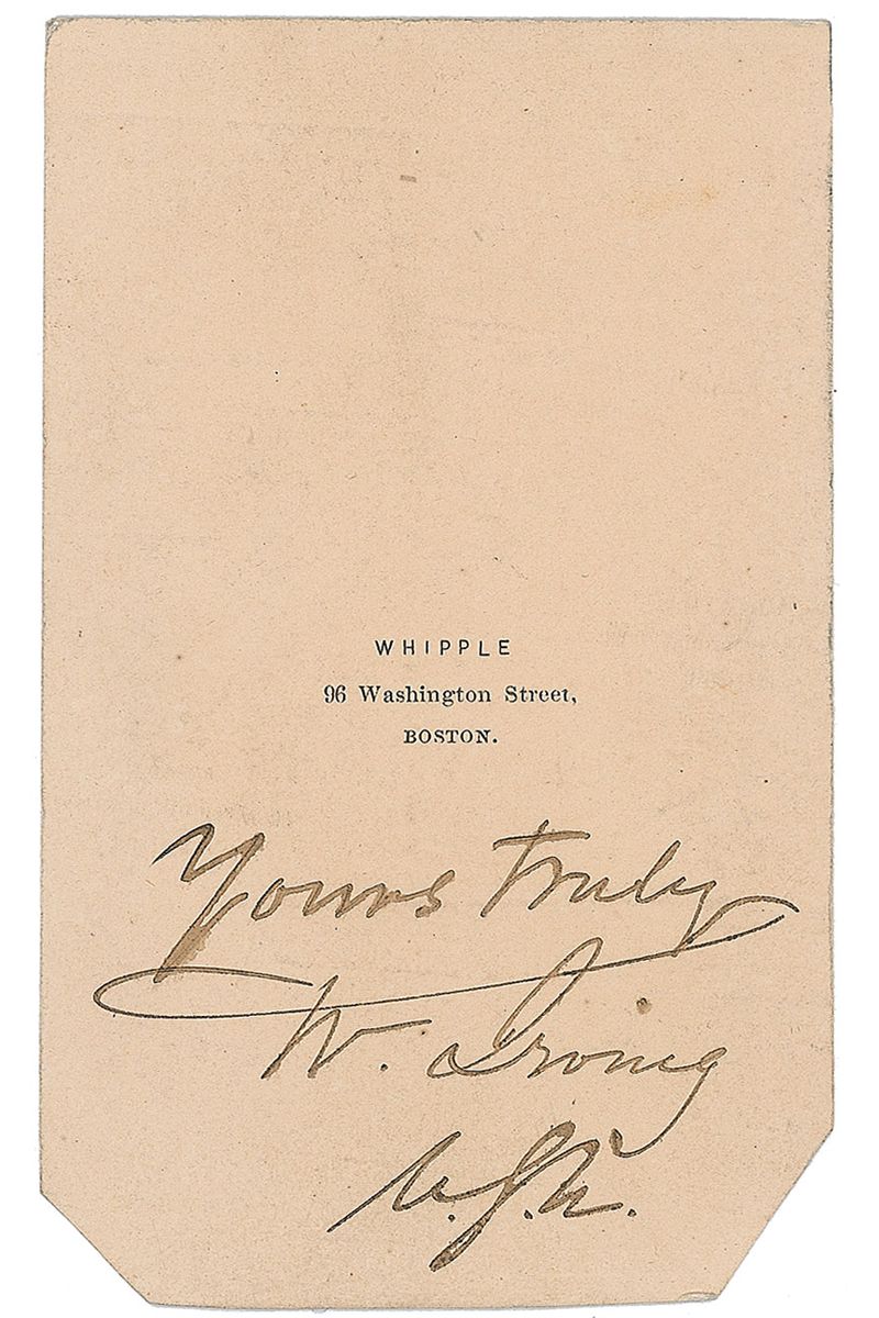 Washington Irving: Original 2.5 x 4 carte-de-visite bust portrait of Irving, signed on the reverse in black ink, “Yours truly, W. Irving, U. S. N.” Published by Whipple of Boston. In fine condition, with clipped lower corners.