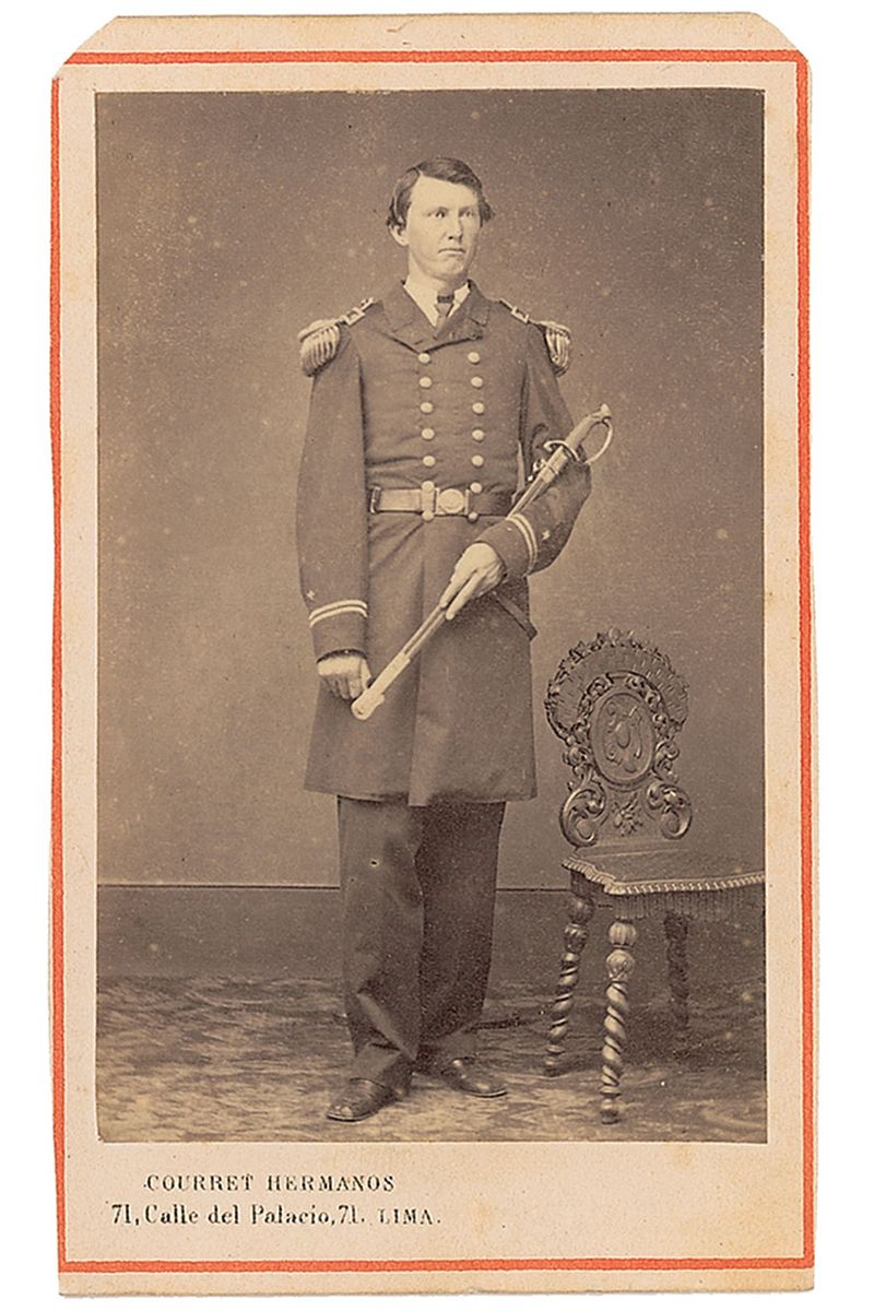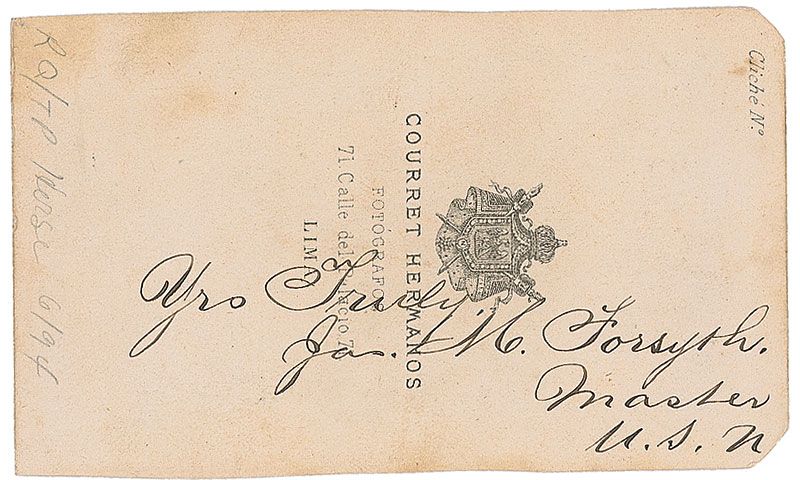 James M. Forsyth: Original 2.25 x 4 carte-de-visite full-length portrait of Forsyth holding his sabre, signed vertically on the reverse in black ink, “Yrs truly, Jas. M. Forsyth, Master, U. S. N.” Published by Courret Hermanos of Lima. In fine condition, with slightly trimmed edges and scattered toning to reverse.