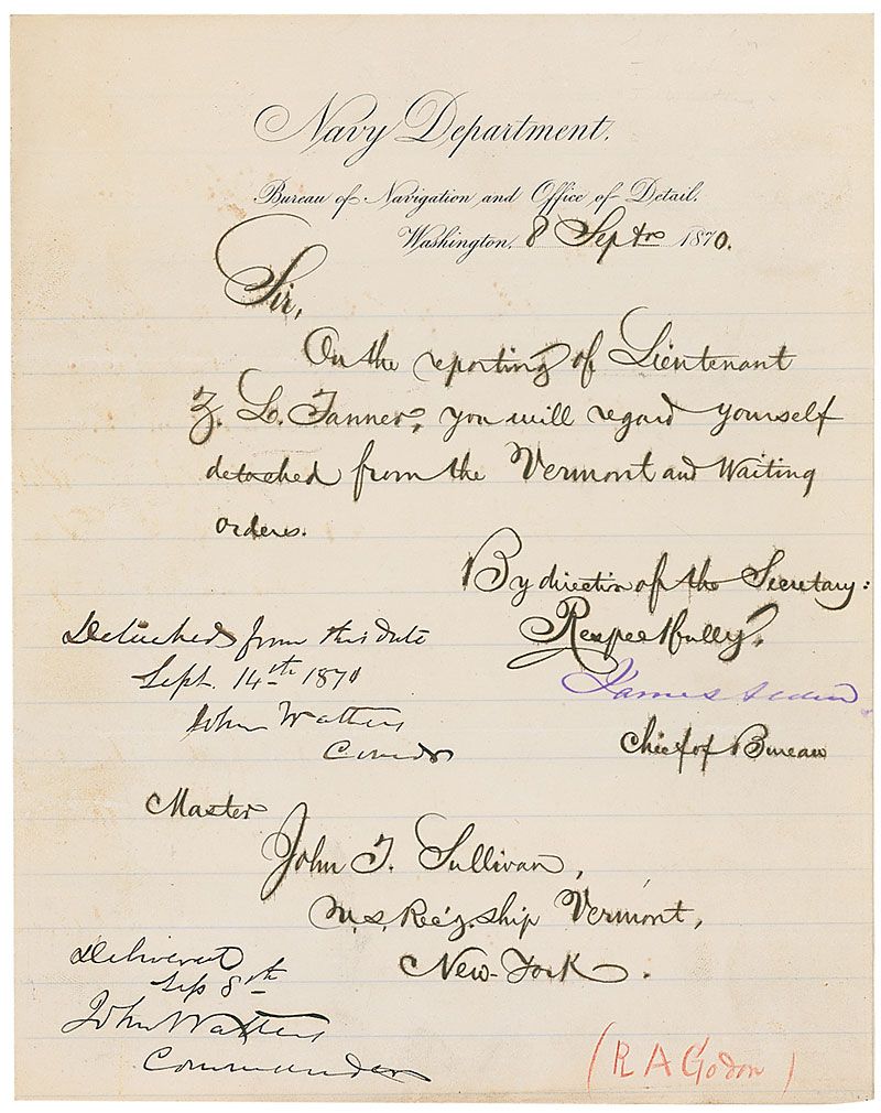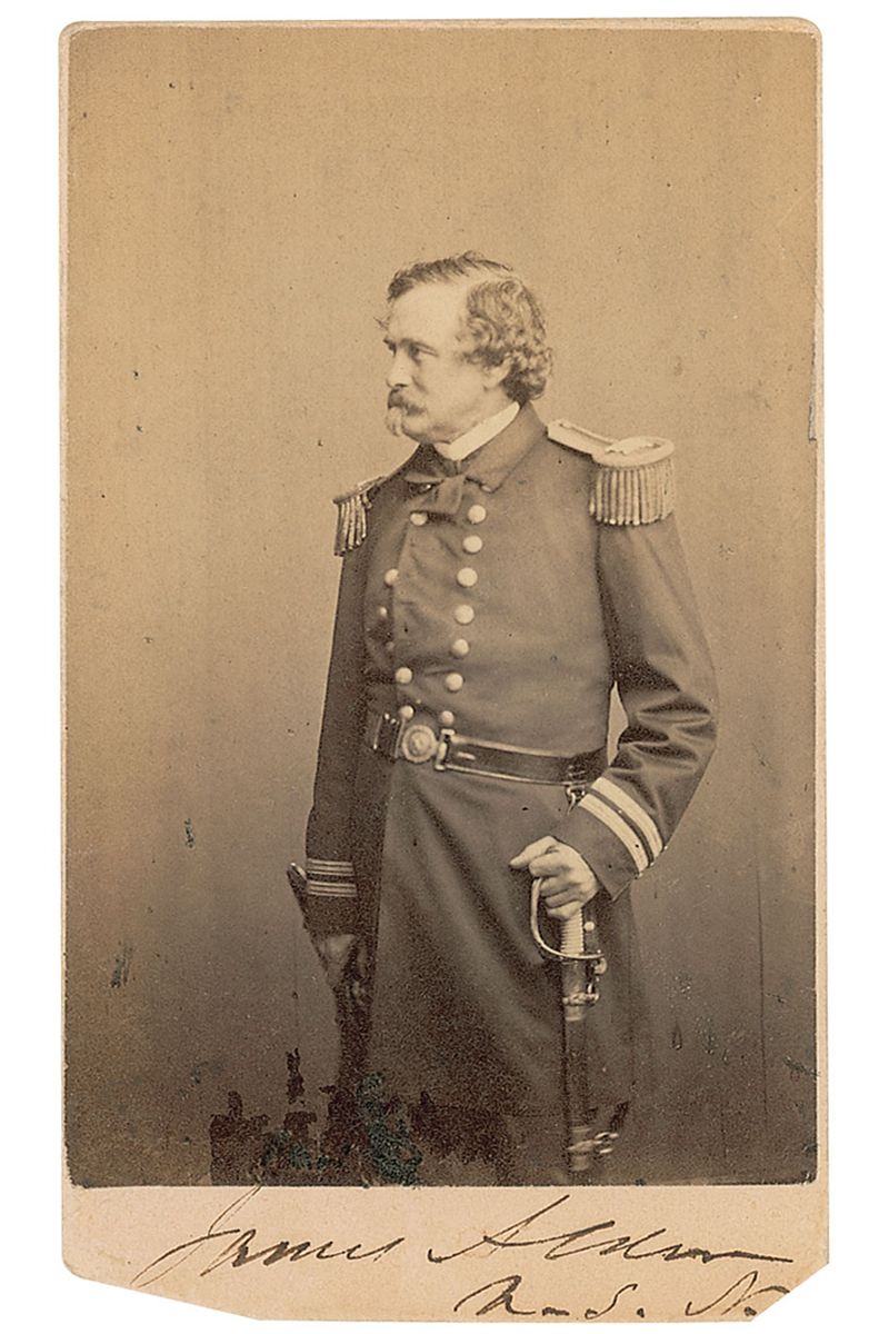 James Alden: Two items: original 2.25 x 4 carte-de-visite three-quarter-length portrait of Alden in uniform, signed in the lower border in black ink, “James Alden, U. S. A.” Published by Whipple of Boston; and an LS, one page, lightly-lined, 7.75 x 9.75, Navy Department letterhead, September 8, 1870. Letter to John J. Sullivan. In full: “On the reporting of Lieutenant Z. L. Tanner, you will regard yourself detached from the Vermont and waiting orders.” Clipped corners to bottom of the carte-de-visite and some spotting at the bottom of the image, and overall feathering to ink and slight foxing to letter, otherwise overall fine condition.