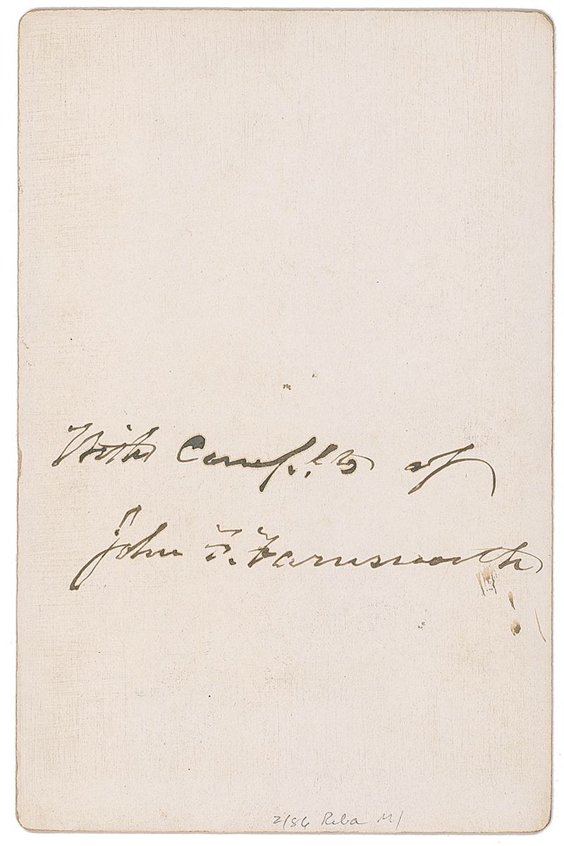 John Farnsworth: Original 4.25 x 6.5 cabinet bust portrait of Farnsworth, signed on the reverse in black ink, “With complts. of John F. Farnsworth.” Published by C. Parker of Washington. In fine condition.